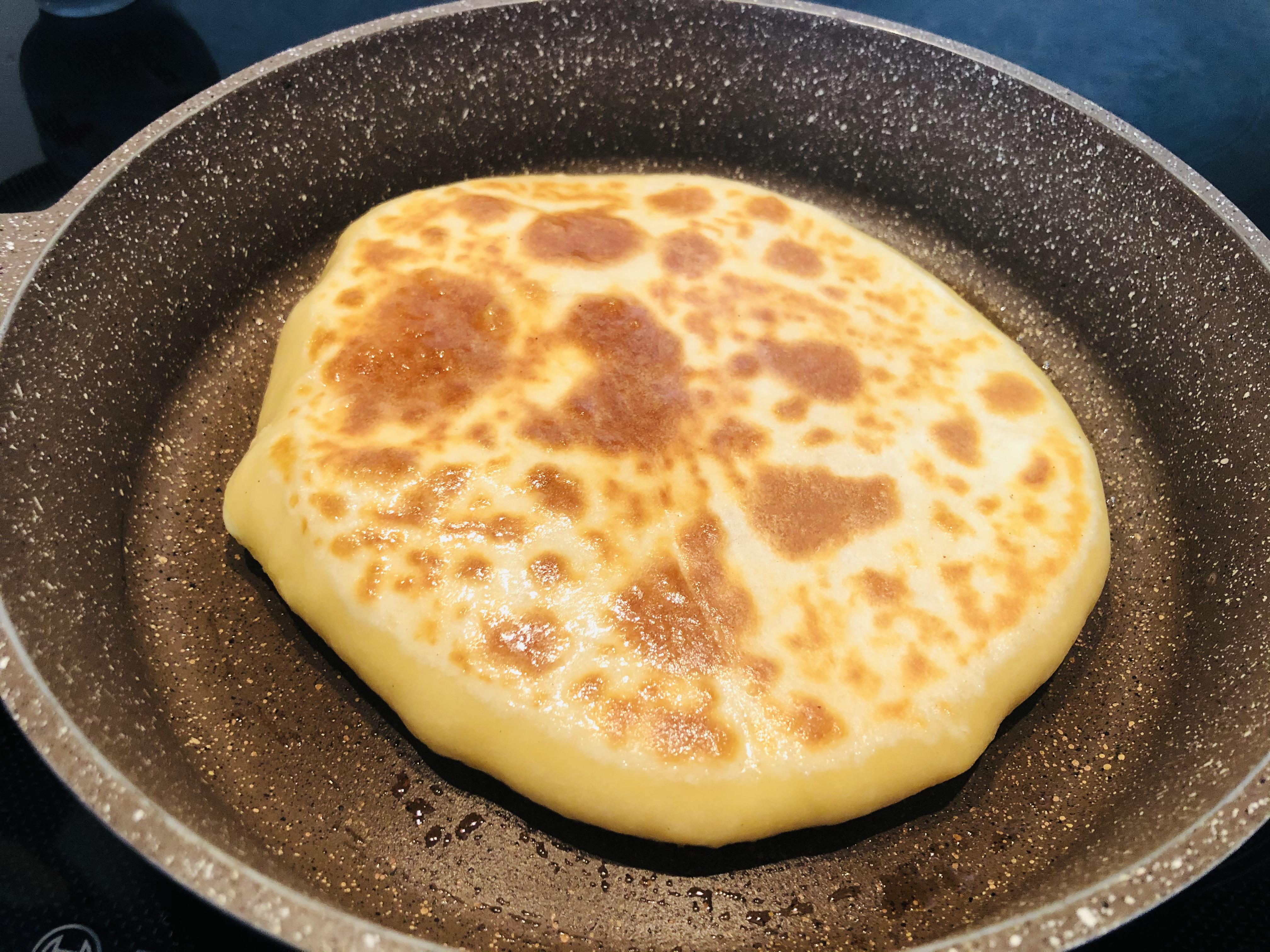 We spread the cheese and potatoes on top. We wrap the dough, turn it over and read to carefully roll it out.