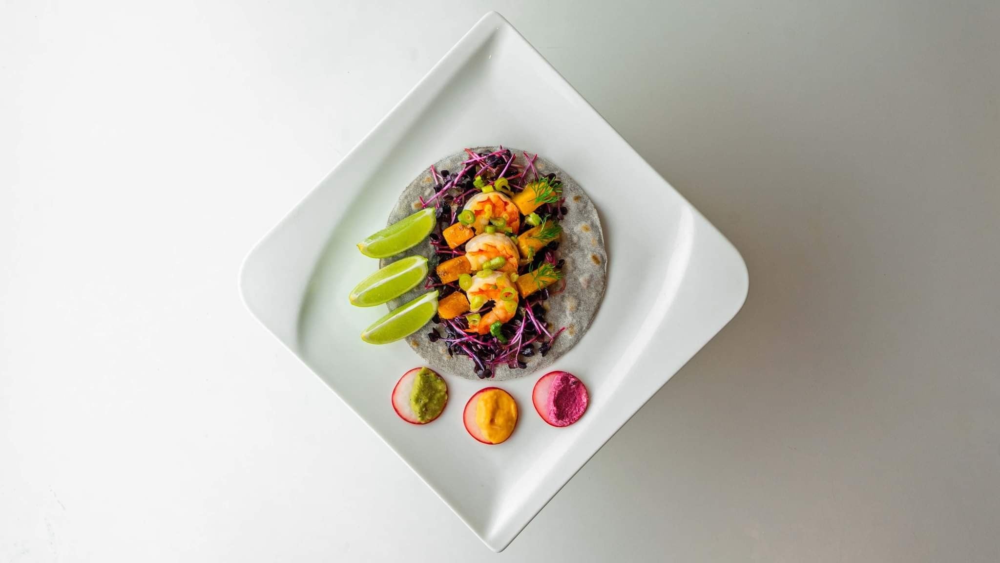 [OC] Tacos de maíz azul, tiger prawn shrimps, melipona honey glazed Hokkaido pumpkin, cress salad, guacamole, cheddar cheese sauce, beetroot sauce. by What_I_Eatery Culinary Culinary Porn