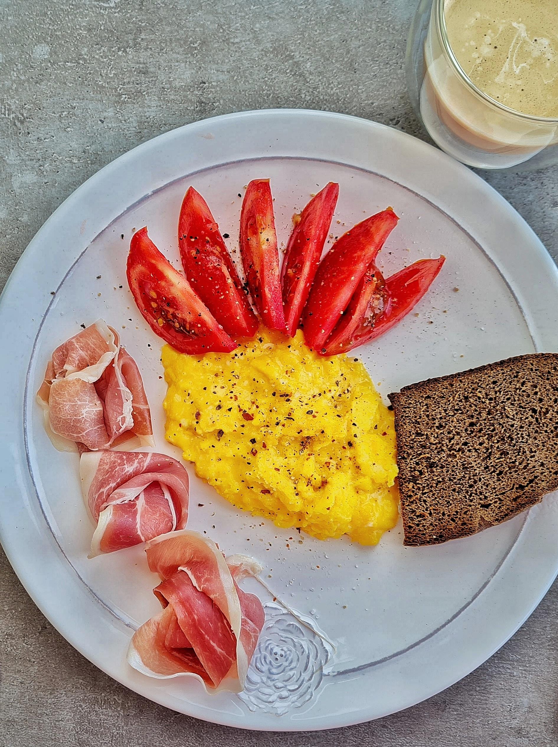 Scrambled homegrown chicken eggs (that’s why they are so yellow), prosciutto, homegrown tomatoes and rye bread by Barron_Gee Culinary Culinary Porn