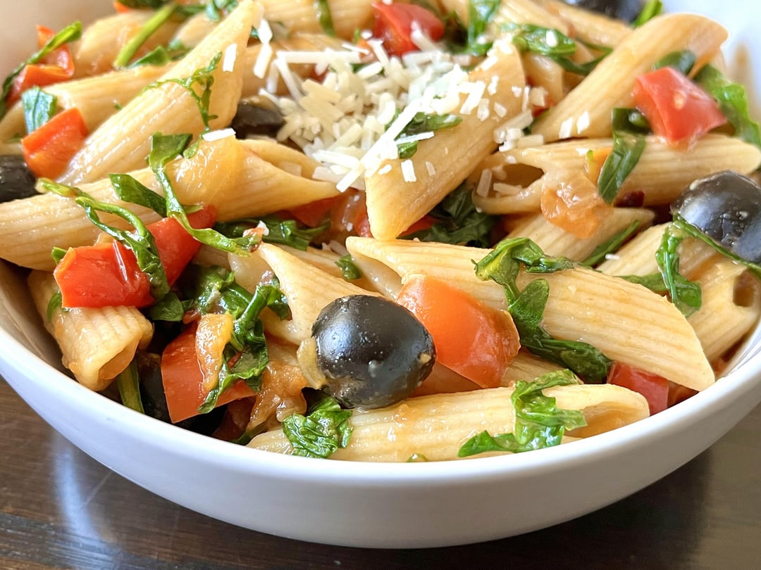 Whole Wheat Penne Pasta – 1 cup, chopped arugula greens – 2 cups, chopped red bell pepper – 1 cup, sliced black olives – 1/4 cup, fresh garlic – 4 to 5 cloves, chopped tomatoes – half cup, cooking oil – 2 tablespoons, salt and pepper to taste, vegan Parmesan cheese to garnish.