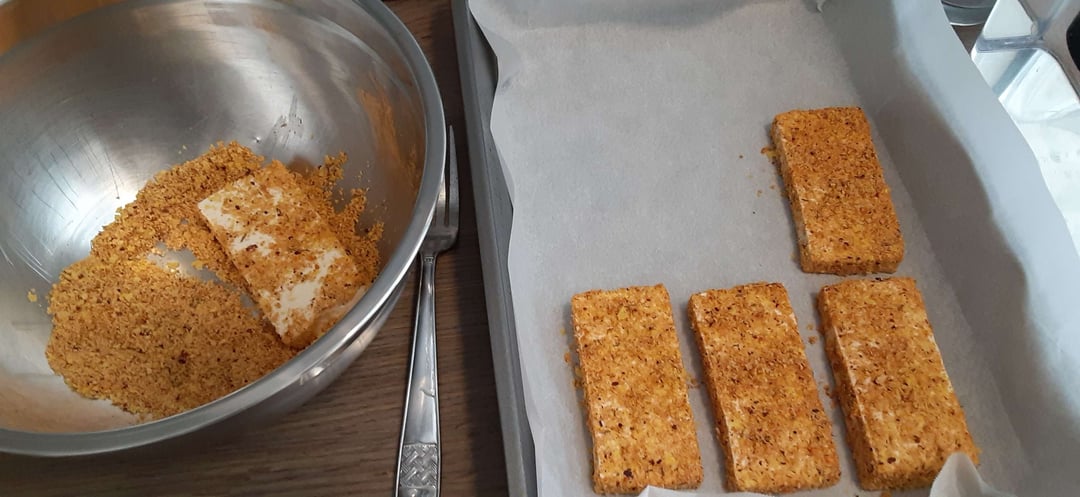 Mix the nutritional yeast, almond flour, chili powder, pepper, Mrs. Dash, and smoky seasoning well. Dredge the tofu in the mixture and place on baking dish lined with parchment paper. Bake for 25 minutes at 350F, then carefully turn the tofu over and bake for 20 more minutes. Herb-crusted dishes usually aren’t flipped, but I wanted to get a seared crust on both sides.