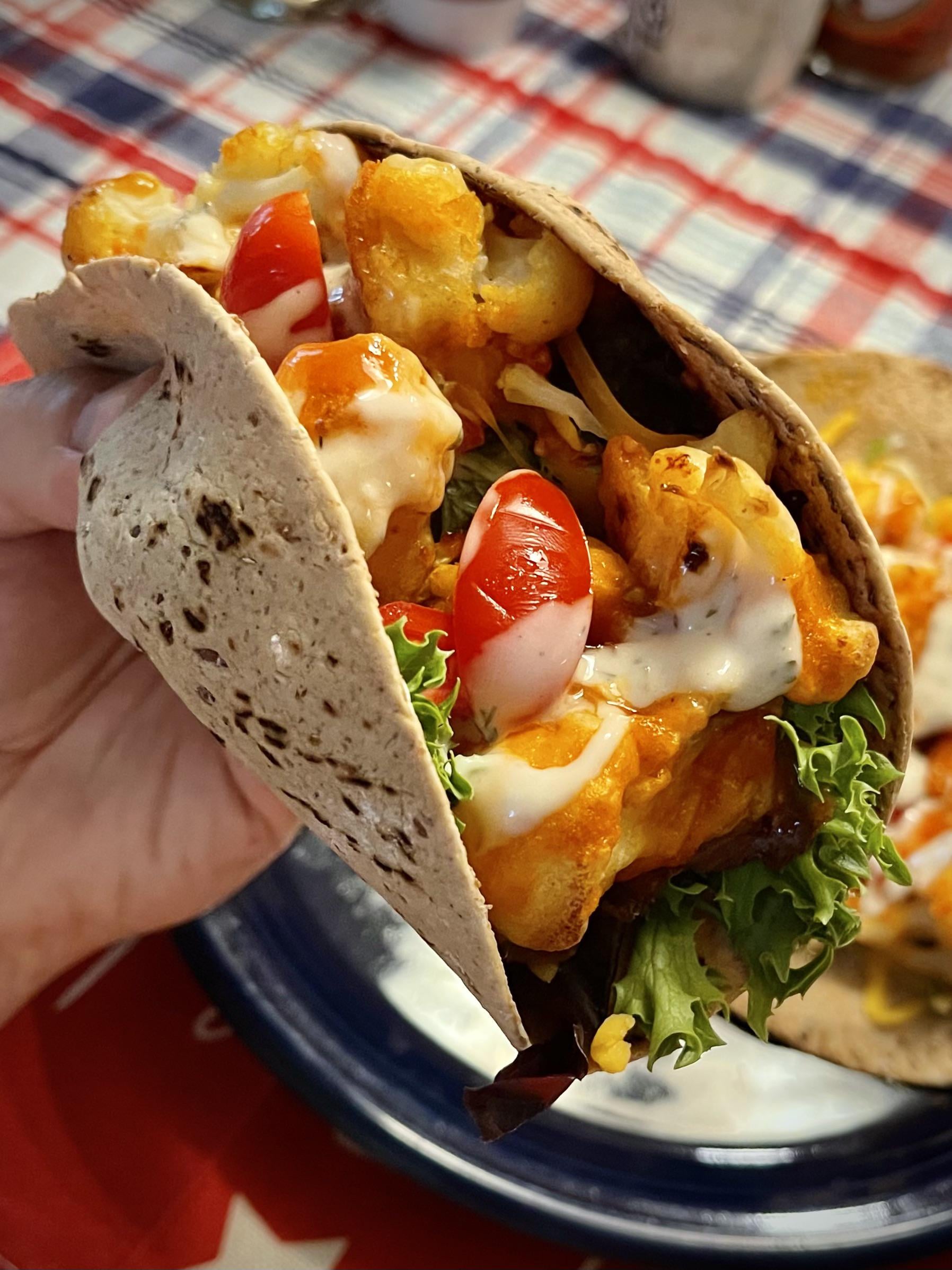 I then stuffed a multigrain wrap with the cauliflower, greens, tomato, shredded cheddar, and ranch.