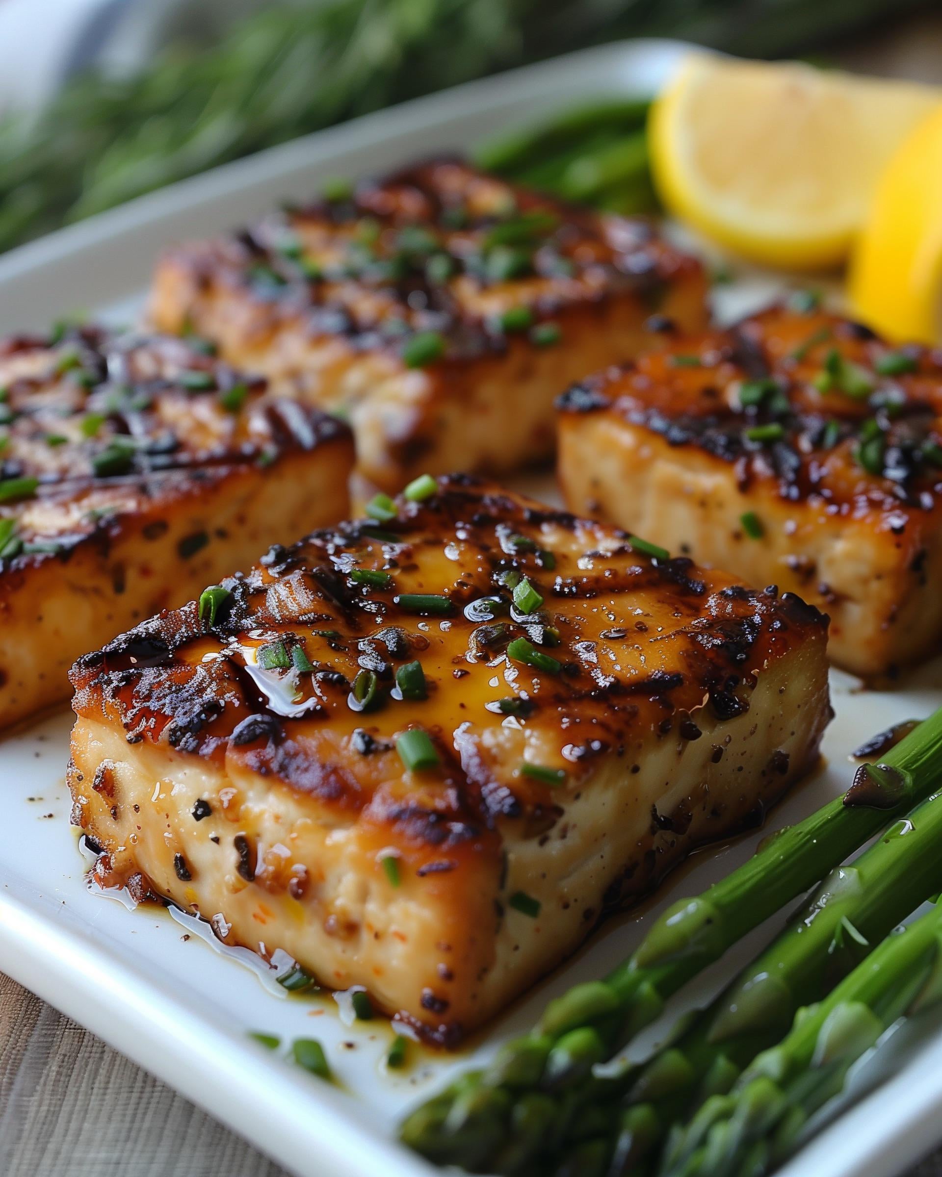 8. Arrange the grilled tofu steaks and asparagus on plates. Garnish with chopped chives and serve with lemon wedges.