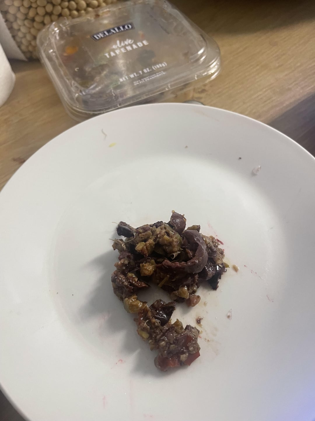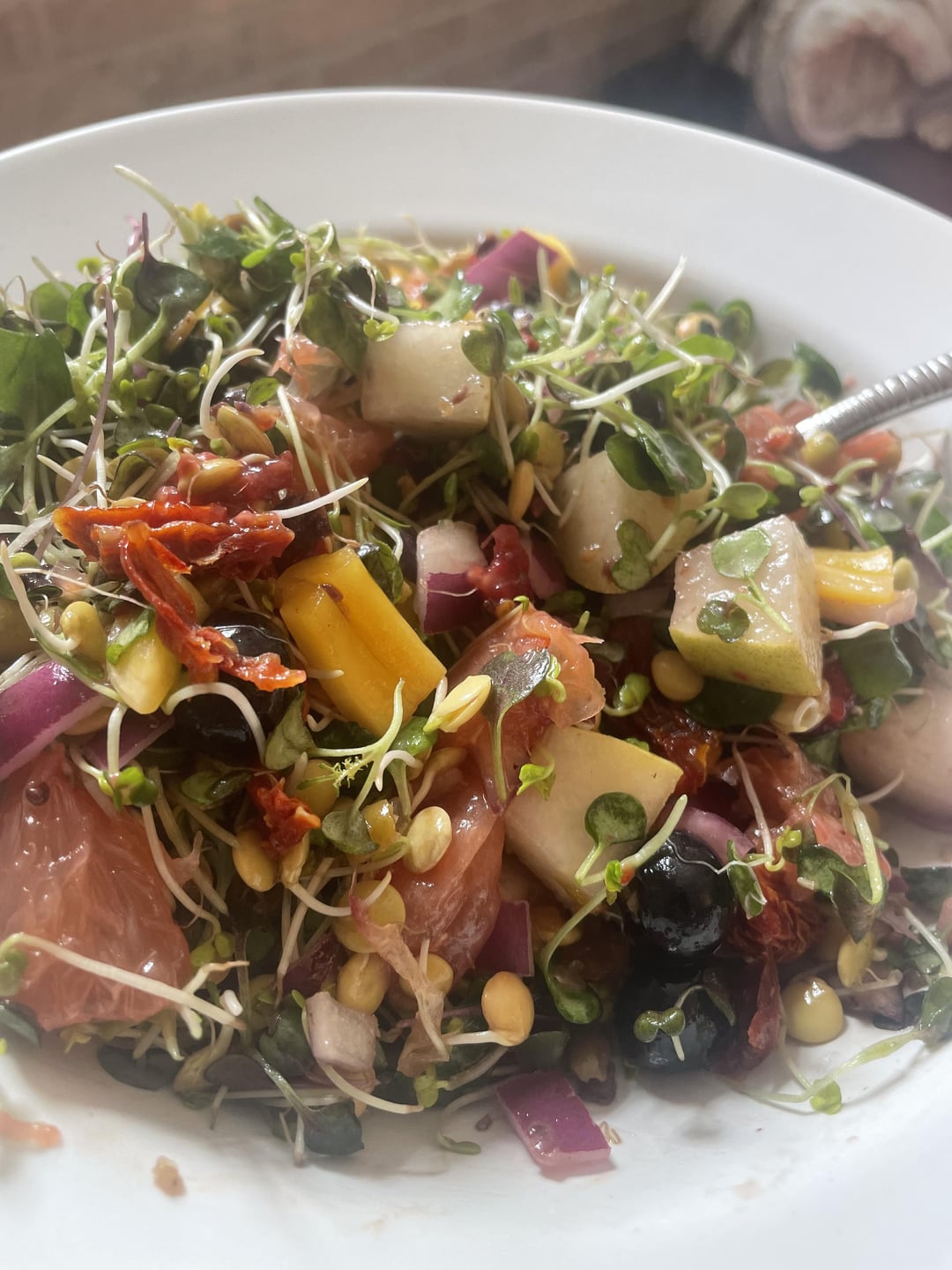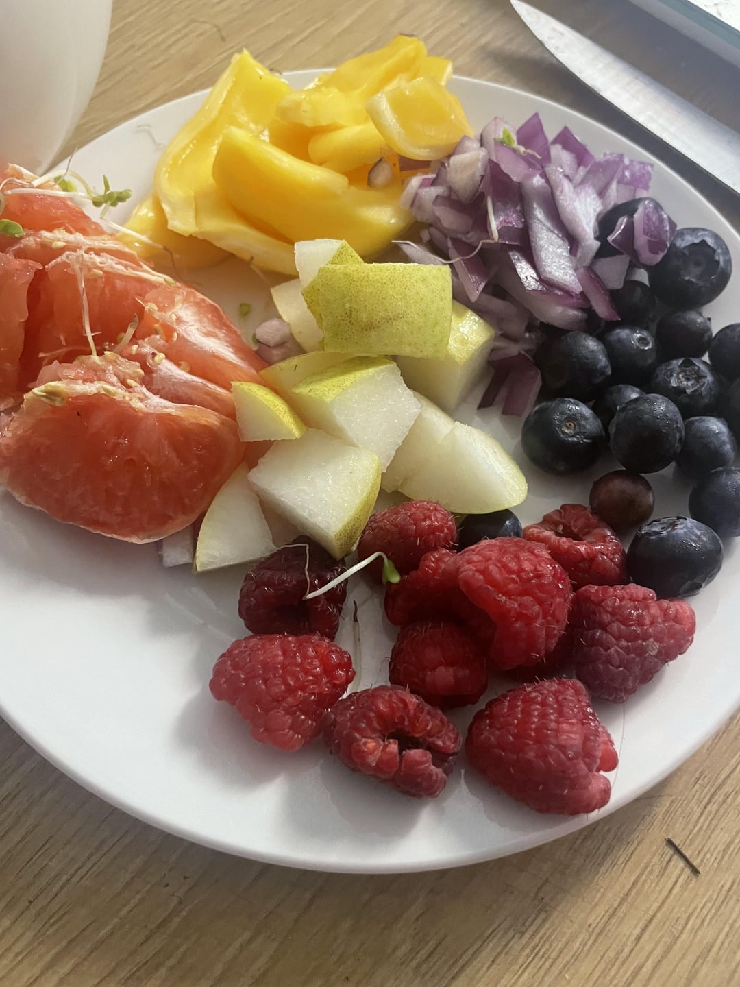 1 oz each of blueberries, raspberries, pear, jackfruit, olive tapenade, sun dried tomato and chopped red onion