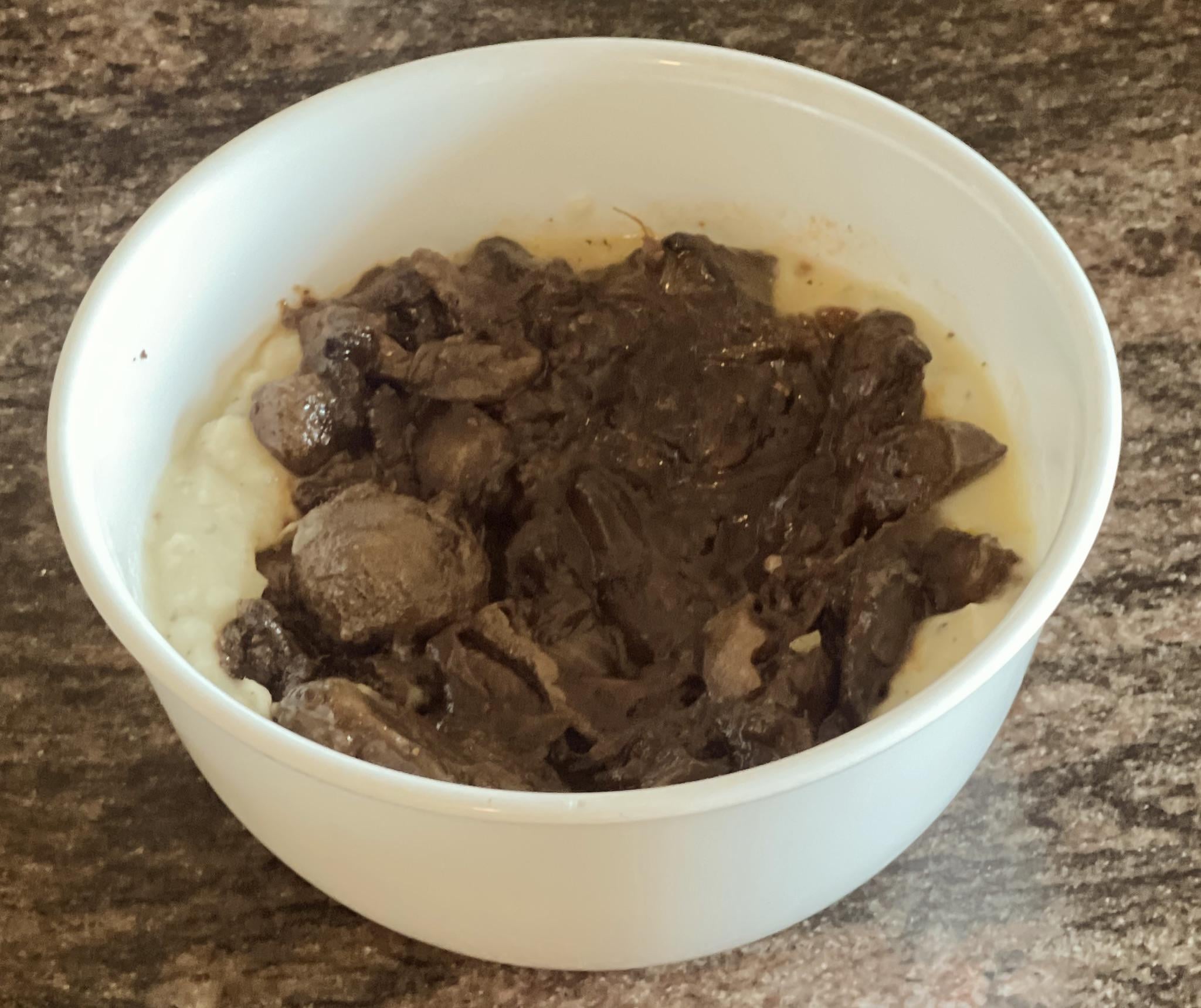 Beef bourginon sans beef. Just chunks of portobello mushrooms in a creamy wine and vegetable broth sauce. Served over creamy mashed potato. by -____deleted_____- Vegetarian