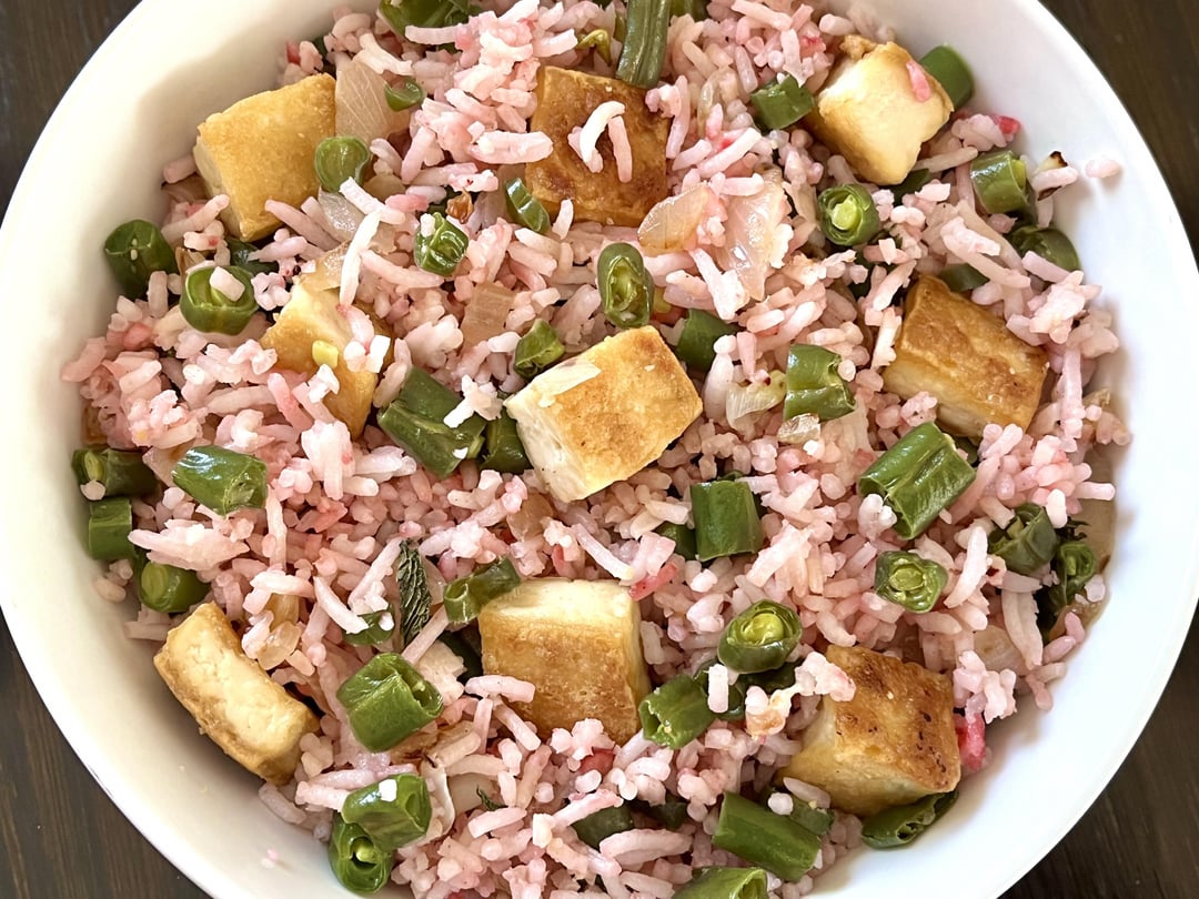 For rice – jasmine rice – 1 cup, vegetable stock – 2 cups, onion – 1 medium sized chopped, Green beans – chopped 1.5 cups, tofu – firm kind half block, powdered beets – 3 teaspoons, cooking oil – 3 tablespoons. Salt and pepper to taste.