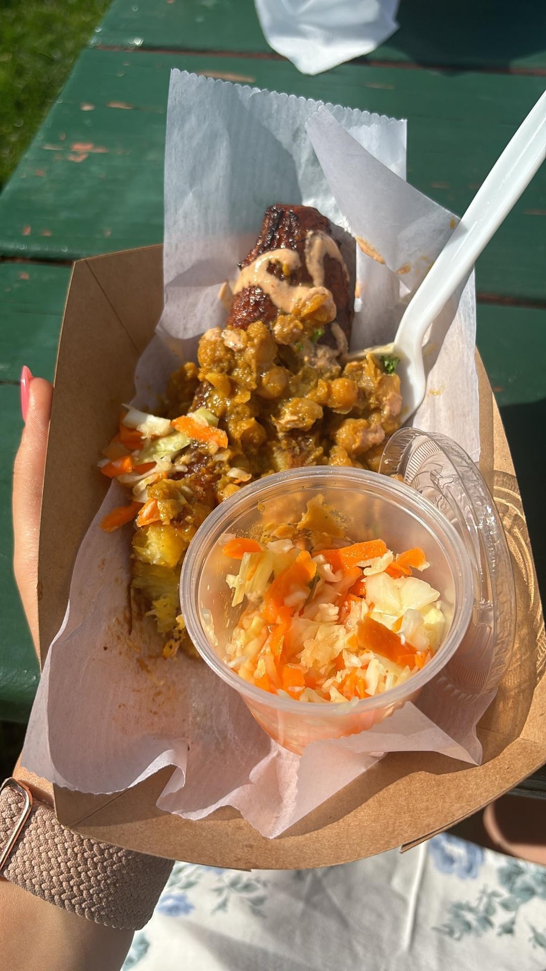 - today was a bit higher calorie as I am nearing my cycle, and indulged in a vegan food truck for dinner (stuffed plantain with chickpea sweet potato curry and caribbean pickle – had to roughly estimate this at ~500 calories but i could be off a bit)