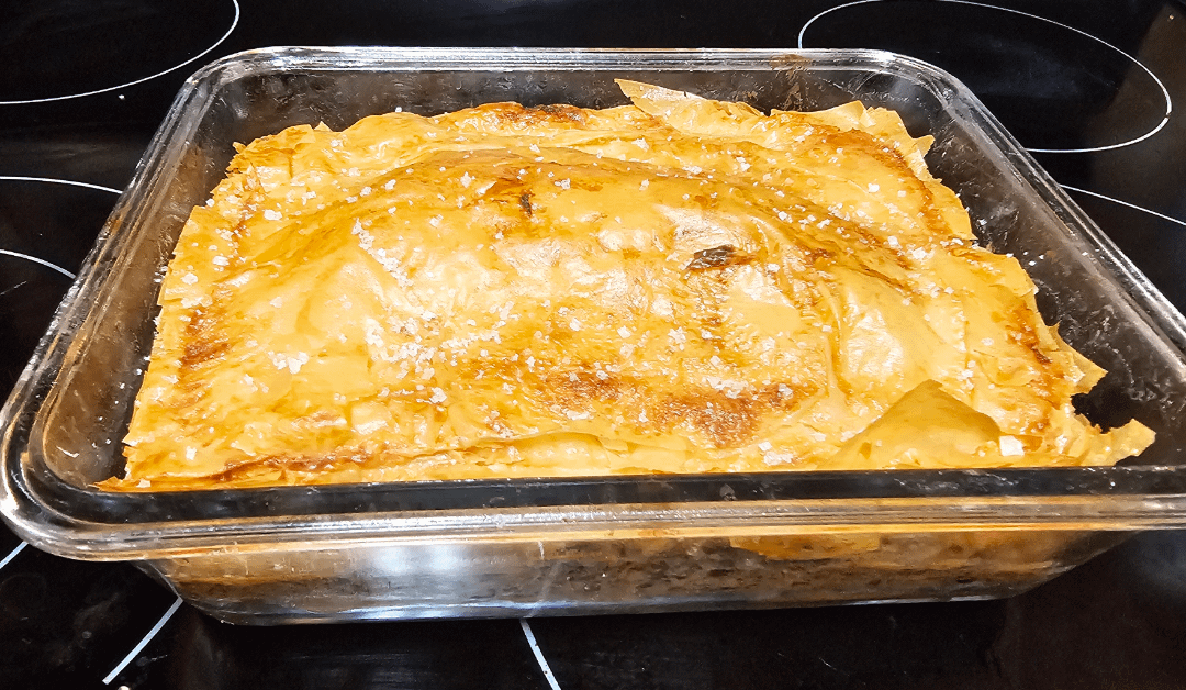 6) Bake for 40-45 minutes or untill golden brown, layers are puffed up, and bottom is crispy. Let rest for atleast 5 minutes.