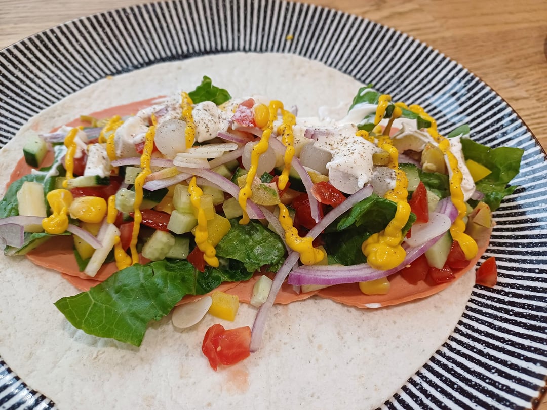 The cheese is Nerominded by I am nut okay, the Ham is the quorn vegan ham slices, the wrap is weight watchers white wraps. For sauces in the wrap I used Hellmanns vegan Mayo and mustard.