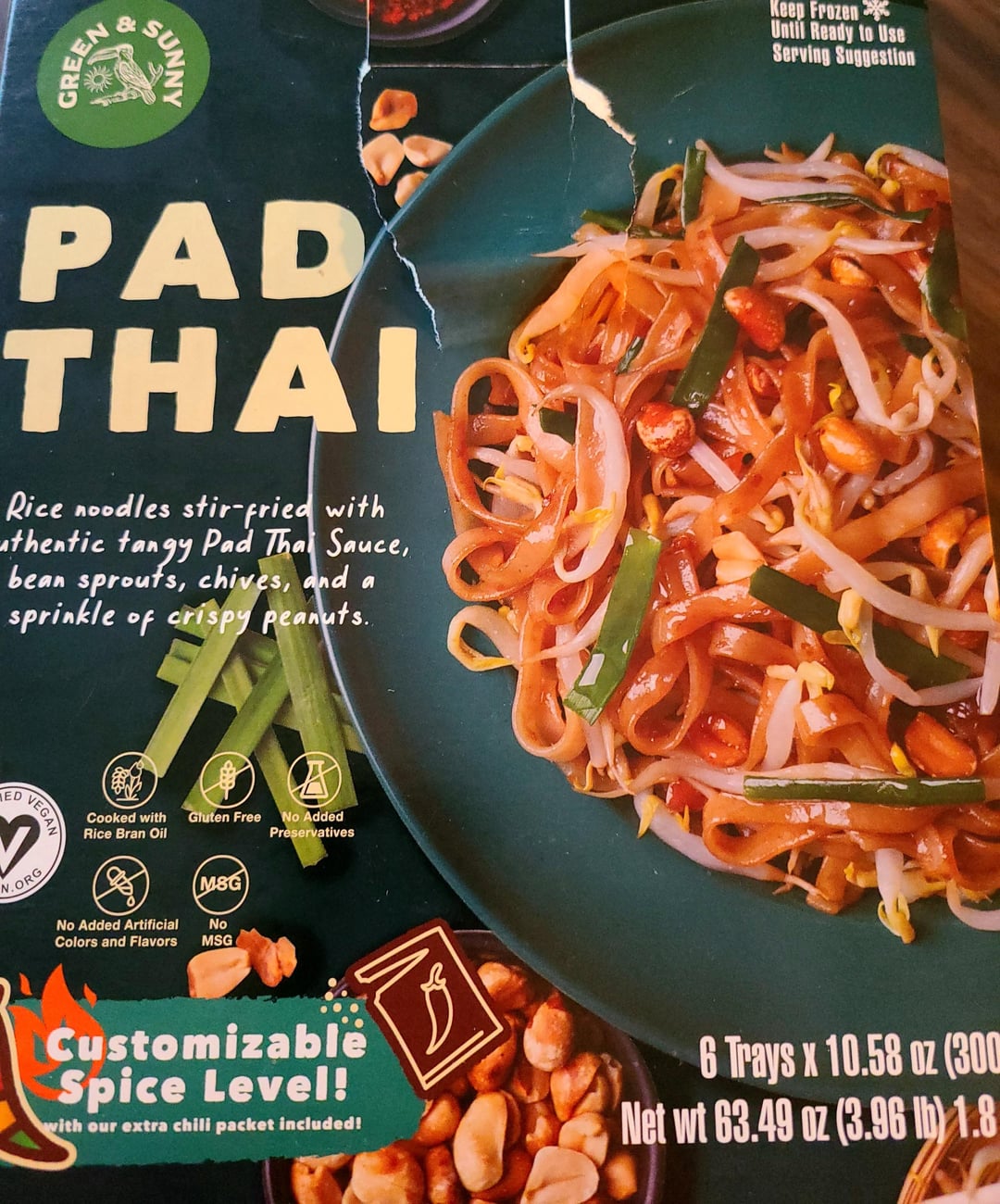 The Pad Thai is frozen and just takes four minutes in the microwave. It's pretty dang great and nice to find a pre-made Pad Thai without fish sauce in it. The recipe for the tofu I used is posted in the comments.