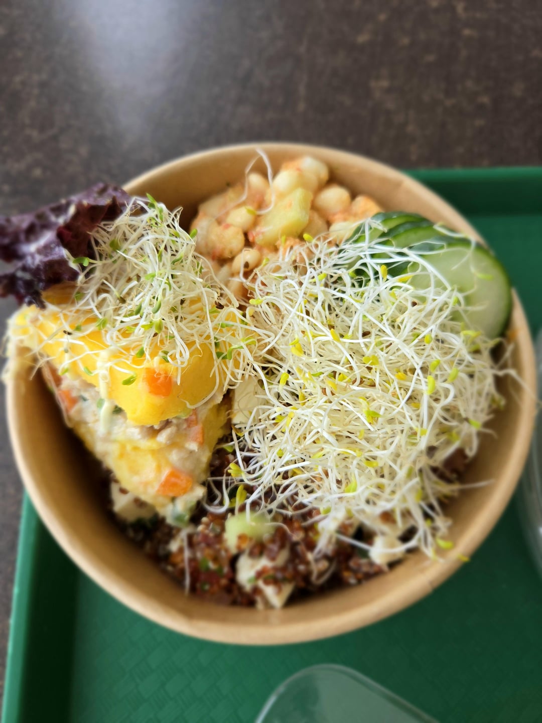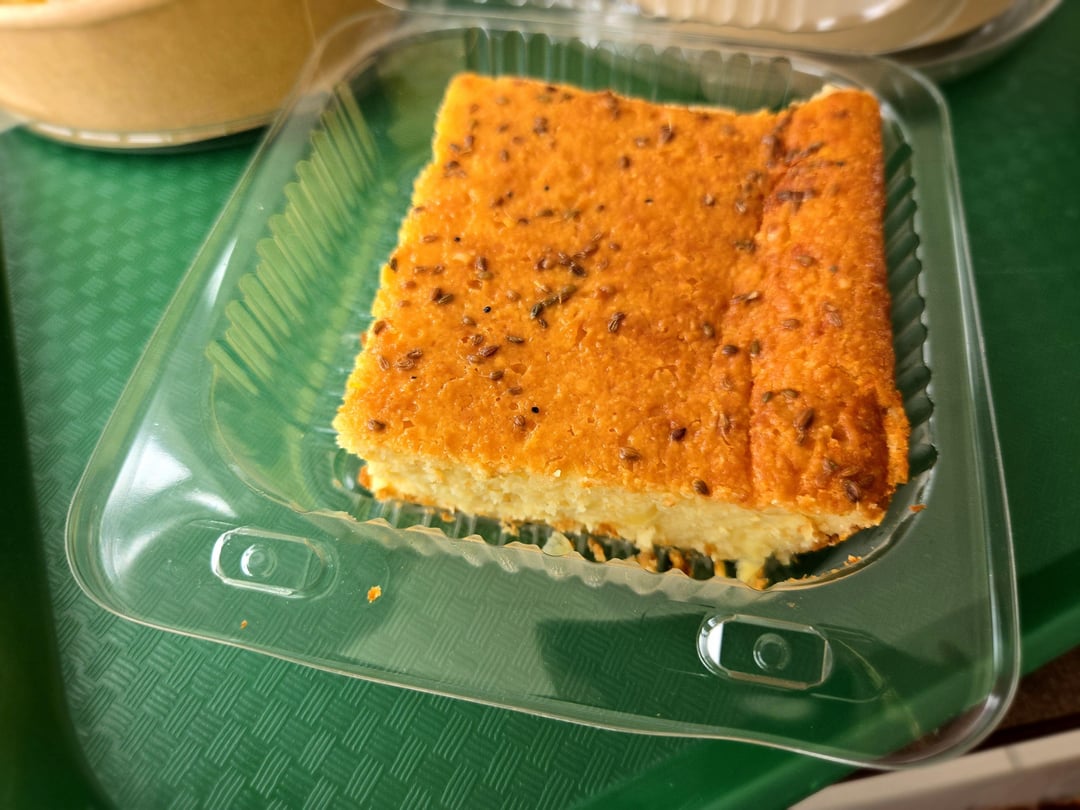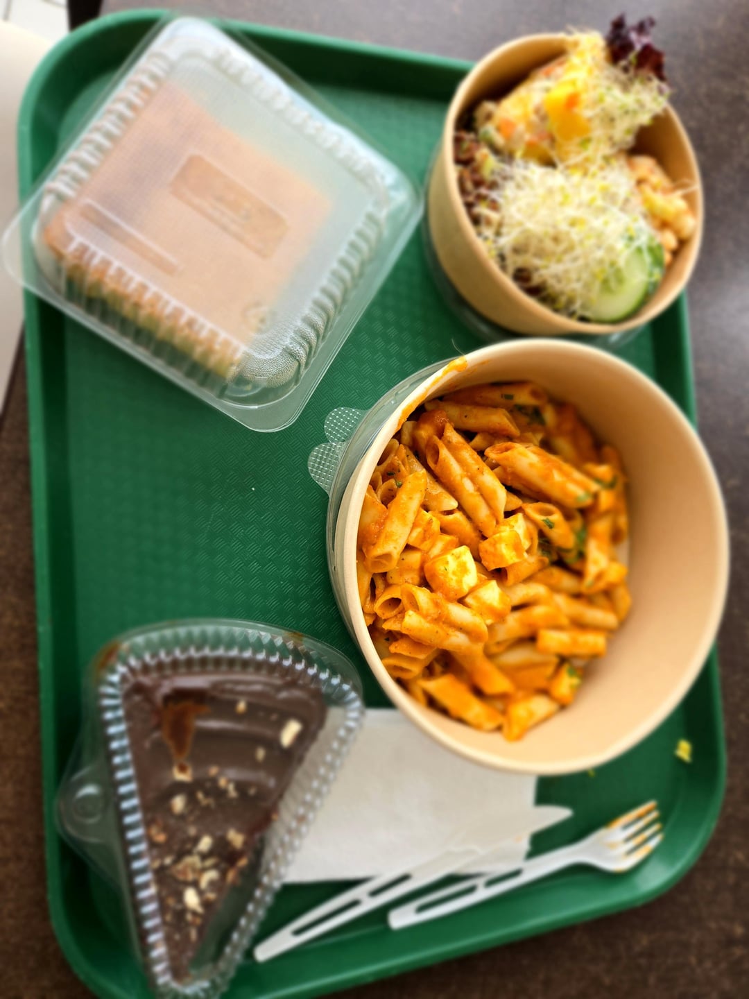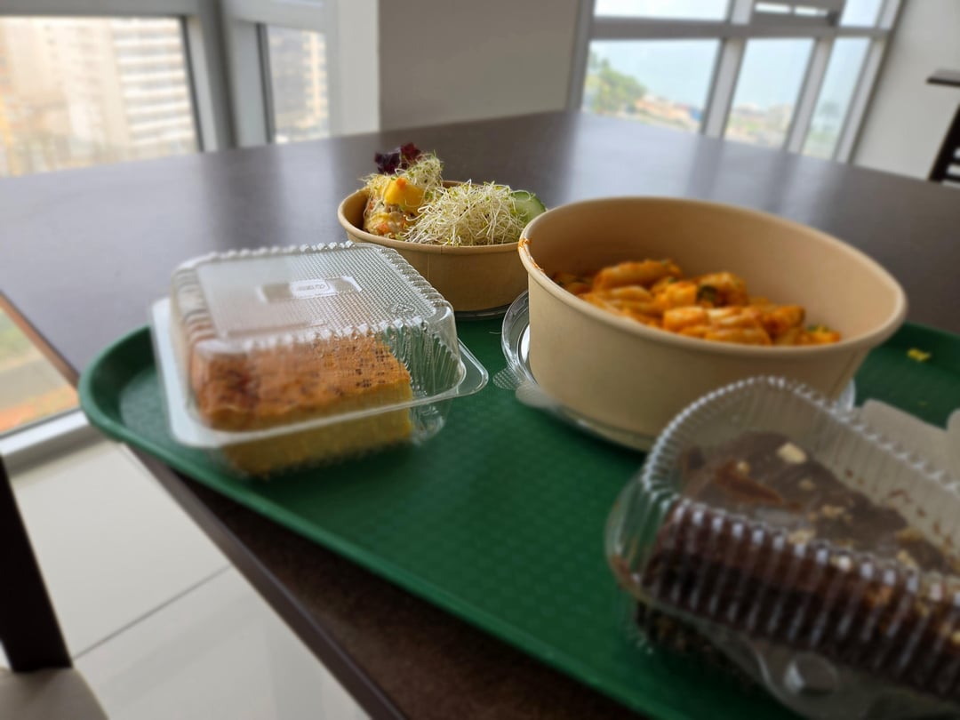 I got the noodles with cheese, tofu and ragu, "causa limeña" (my favorite, it's a potato dough with veggies), bean cebiche, quinoa tabouleh, sprouts and cucumber, cheese cornbread and chocolate cake.