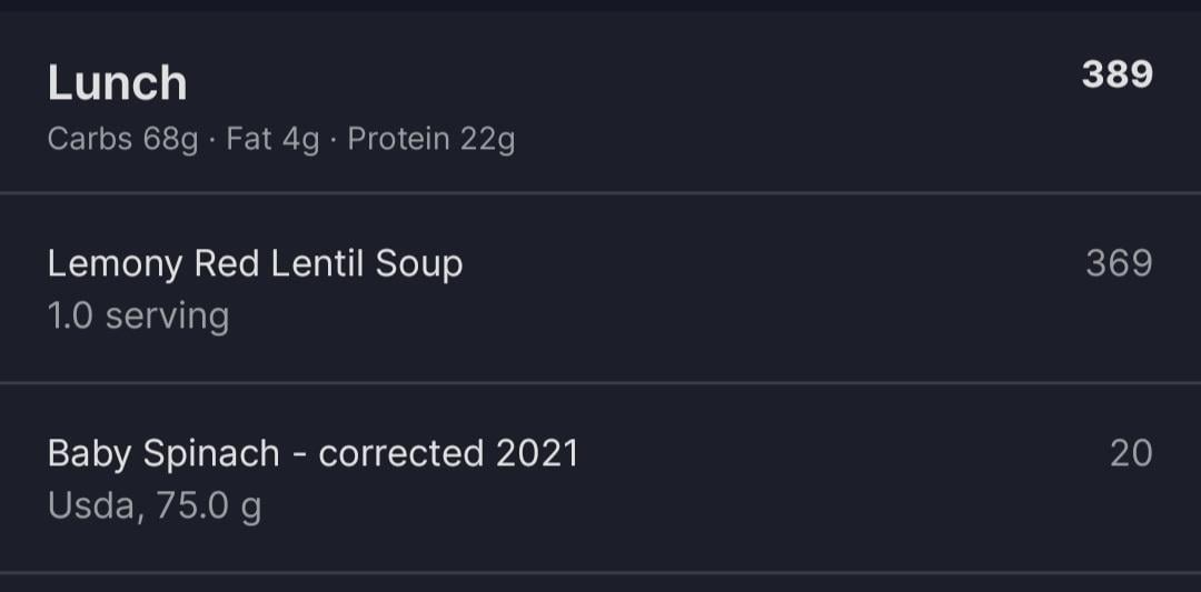 Forgot to mention that I portion the soup into 6 servings so each serving comes out to 369 calories. The spinach adds 20 calories.
