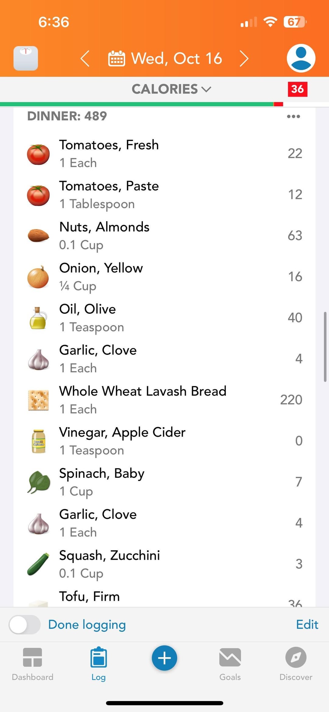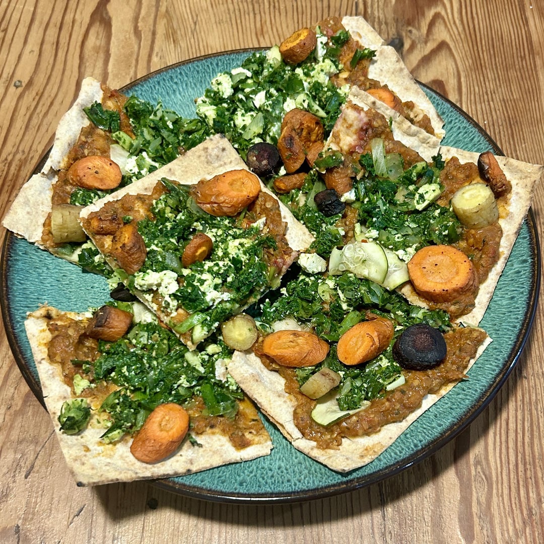 A whole wheat lavash with homemade vegan tomato sauce (garlic, tomatoes, tomato paste, spices, onion, almonds, a little olive oil), zucchini, roasted carrots, garlic, zucchini, and crumbled tofu. Very weird but it’s what I had on hand in the fridge, and it’s pretty healthy!