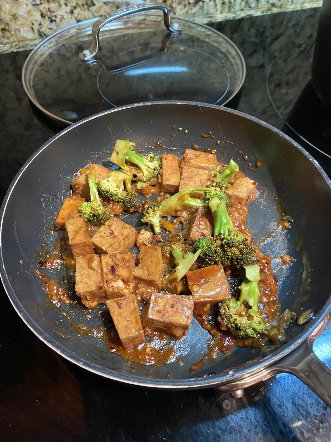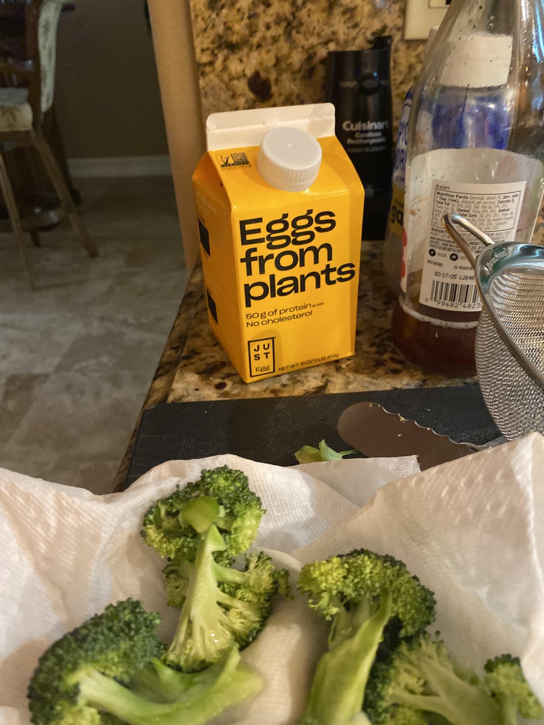 Then I add most of the sauce but I leave a little prob around 3 tablespoons I let it cook a little once I see it's absorbed it I flip them and add the broccoli make sure the broccoli is on the pan not on top the tofu, so it soaks the sauce.. then using a spoon I add the rest of the sauce over each broccoli. I cook it a little longer, and add the just egg I give it a min and a half prob then I cover it. I just look at it and see if it looks ready don't know how else to explain that lol it's just preference on how cooked you like your broccoli
