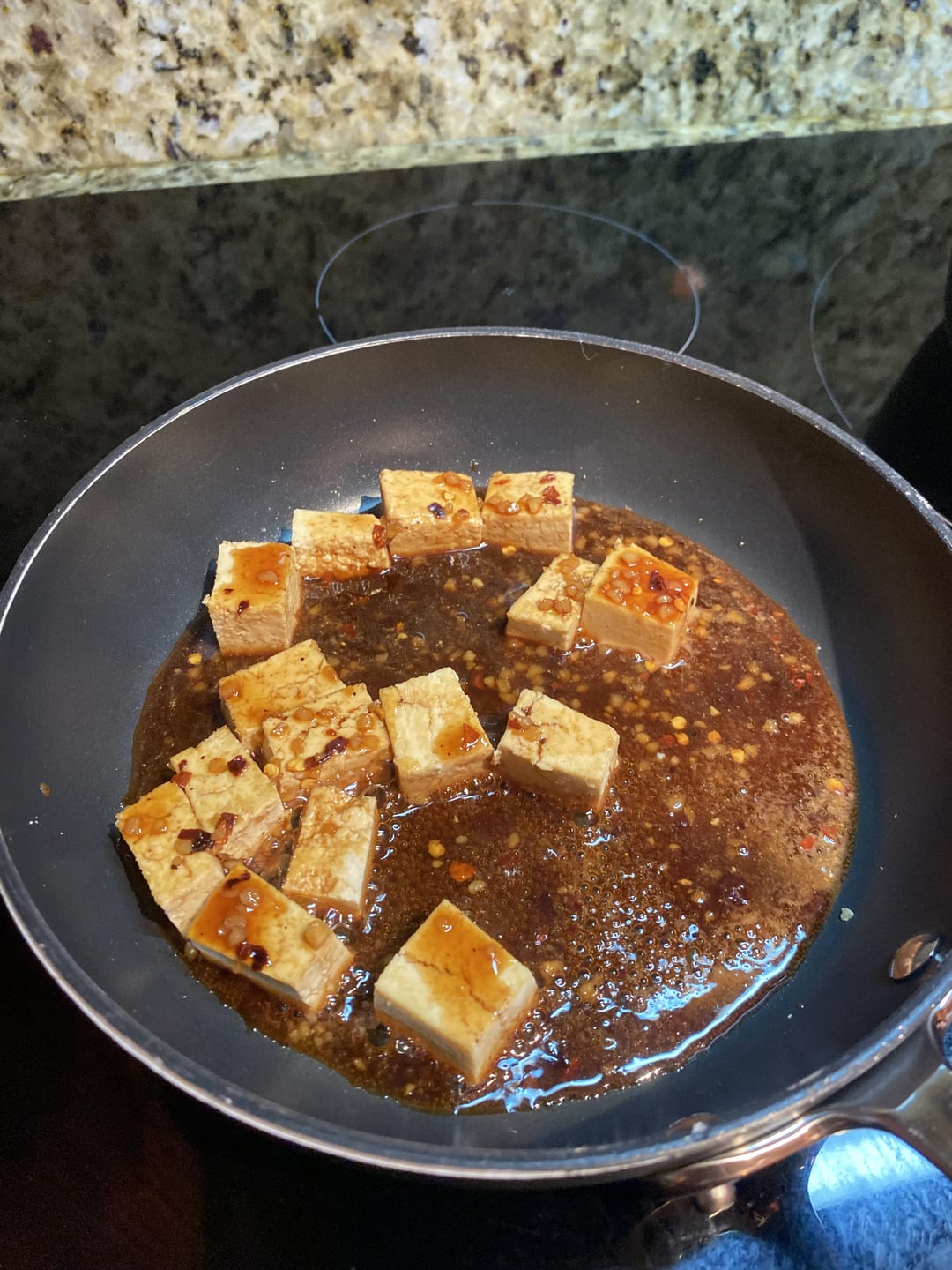 I add a lot of chili flakes that's optional depending on how spicy you like things Mix all these ingredients in a bowl Get your tofu pat it dry Then turn your pan onto medium heat, I add a little vegetable broth and fry the tofu on one side this makes it absorb the sauce better not sure why)