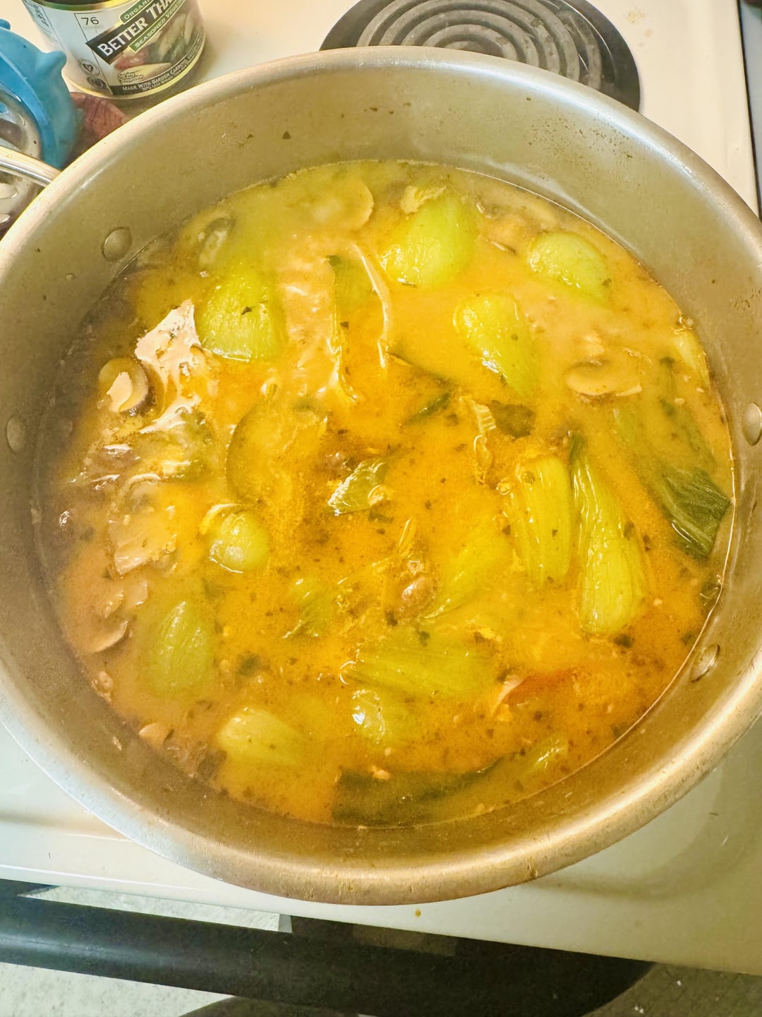 I mixed all of the spices and herbs and such together for the broth. Including coconut milk and lime leaves, etc. Then I put in tofu, mushrooms, rice sticks, bok choy, and tomatoes in that order. Taste and see if it needs more sour, ginger, chili, etc. Then garnish with some cilantro.