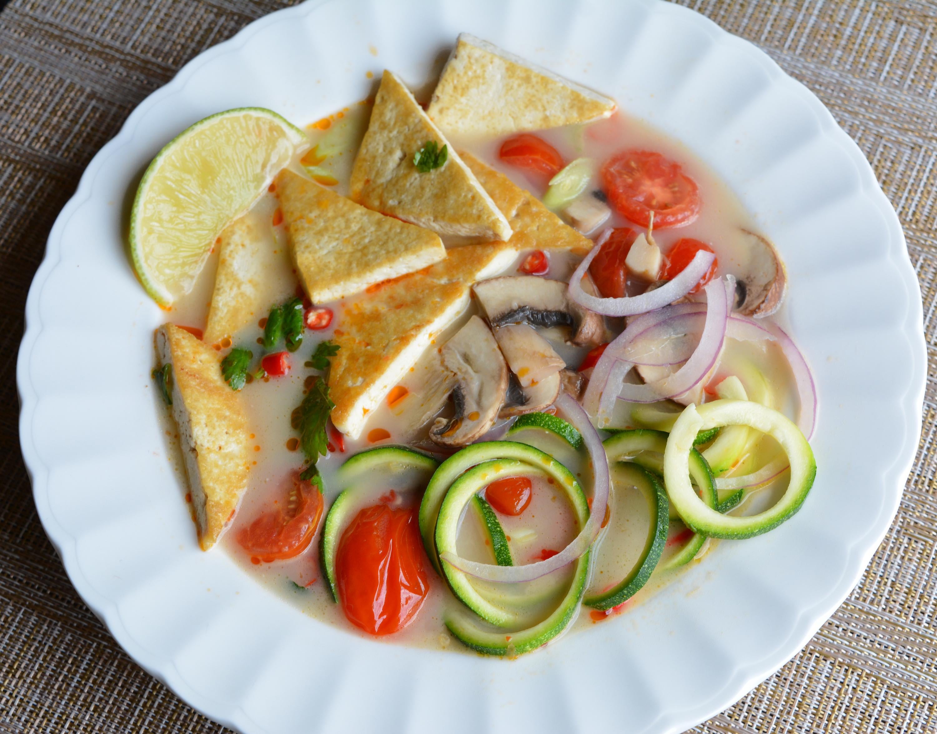 Home»1200 Calorie Vegan»Tofu Tom Yum with zoodles is the perfect low cal snacking soup. 14 g protein and 195 cal per 1.5 cup serving.