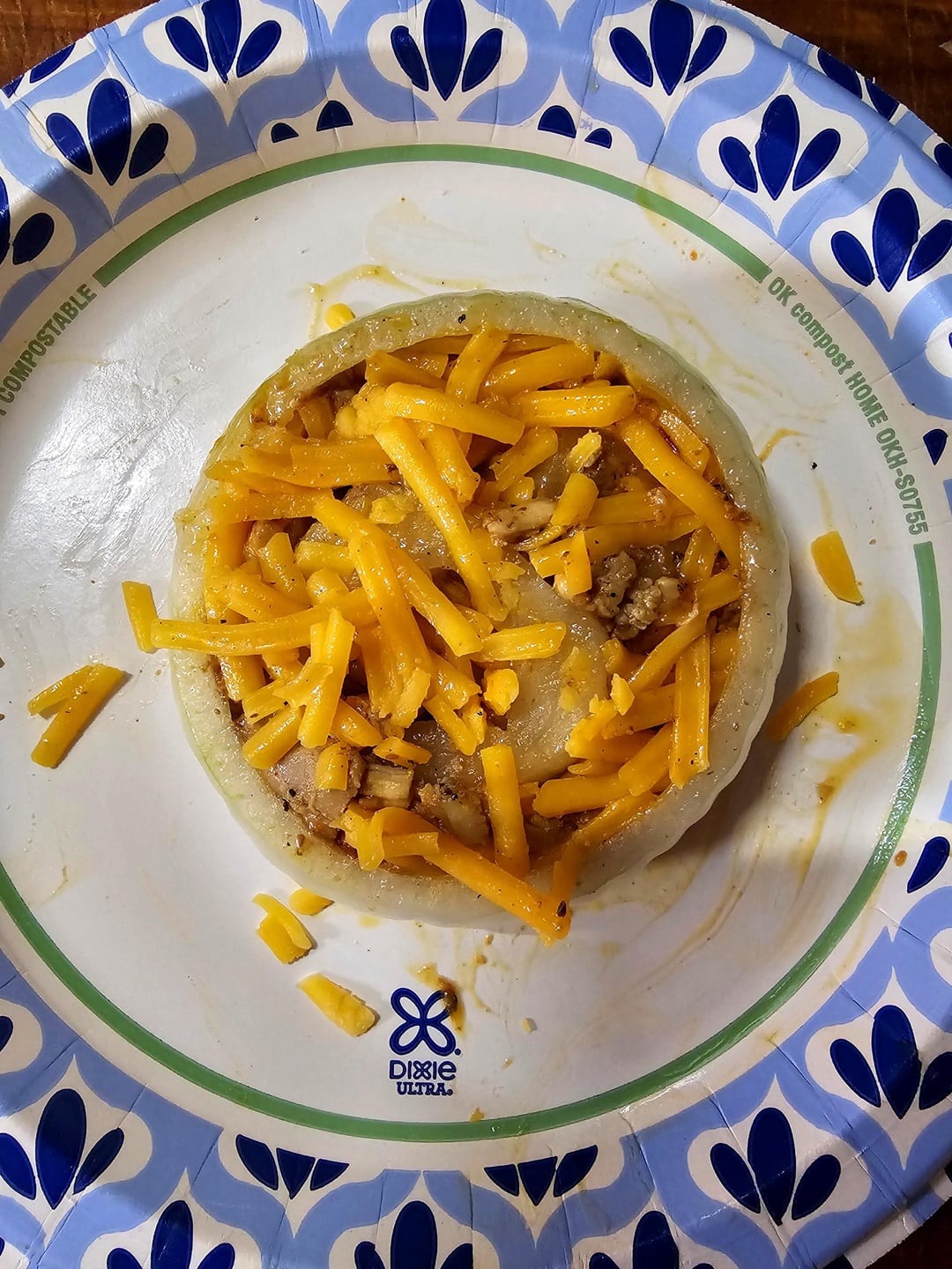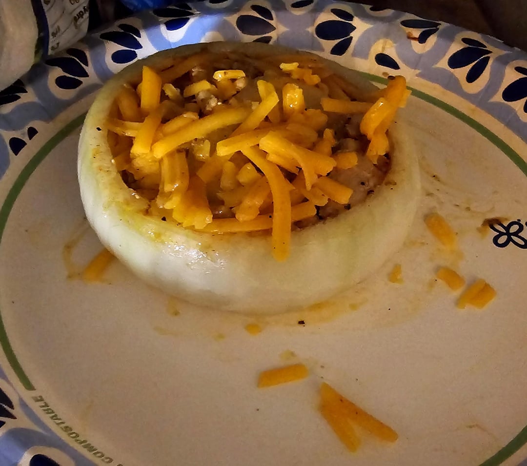 I used a vidallia onion for this, the size and shape looked like it would work the best for me. Remove the outer ring carefully without breaking it and a couple smaller inner rings for the middle. You could also use one medium sized ring to stuff between and maintain the ring shape but I don't mind extra filling.