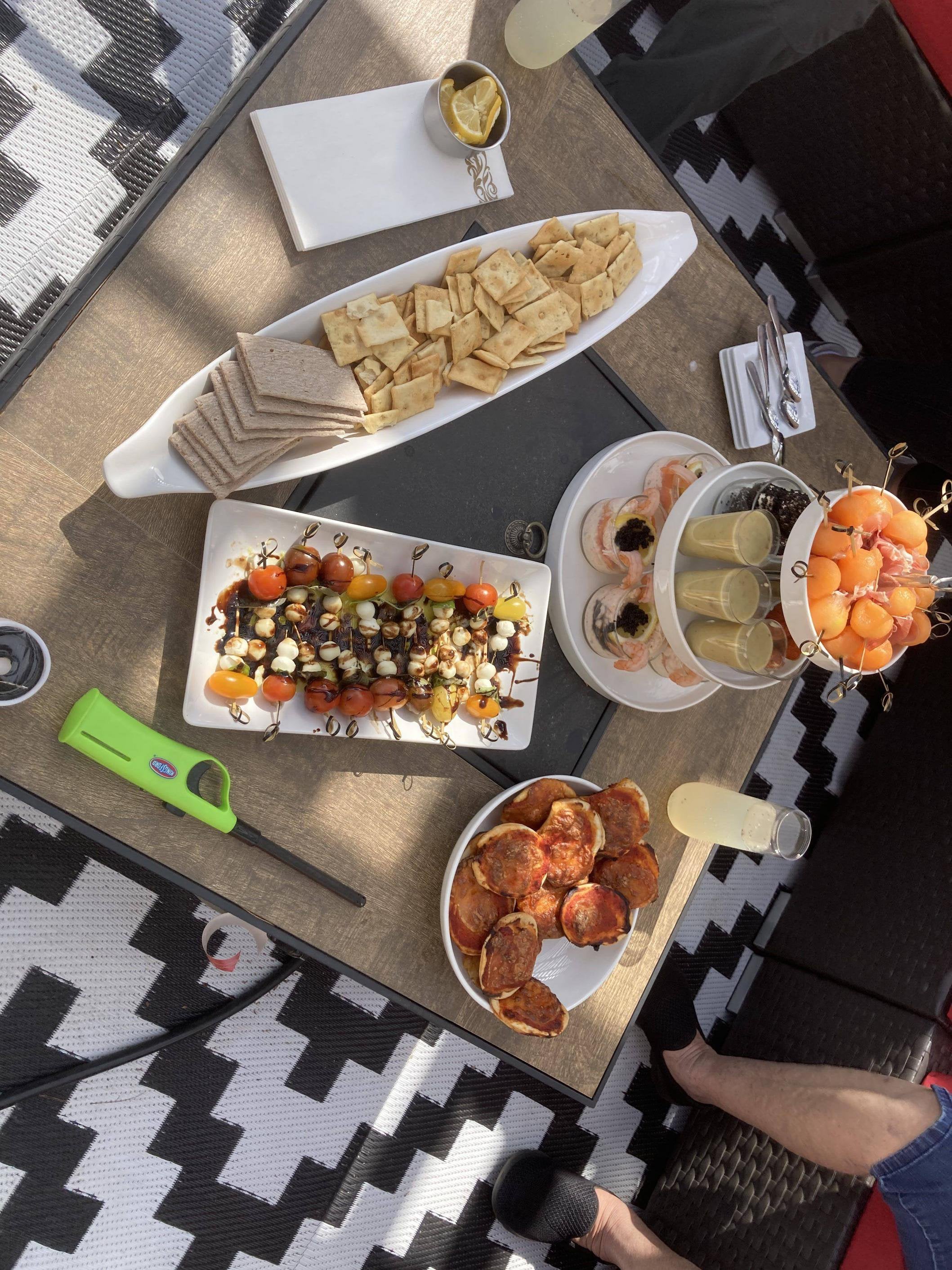 Please tell me what the tomato items are and the organs ball items. And also the things at the very bottom of the pic and the shrimp (?) things in the glasses are.
