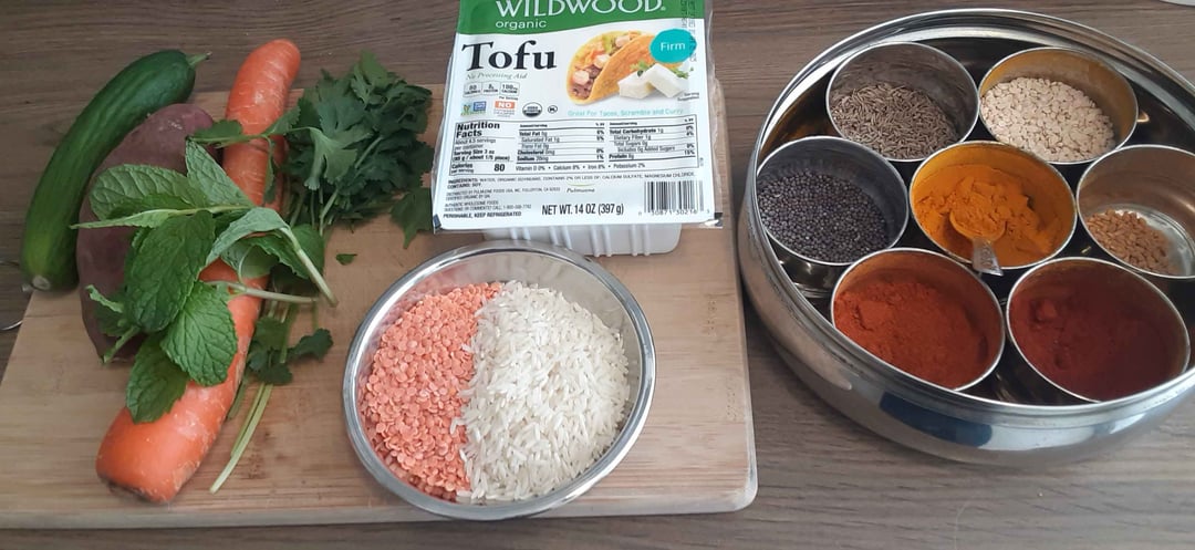 verdantsf on February 9, 2025 11:19 pm Clockwise from the top, recipes linked: * [Tofu Bhurji](https://www.vegrecipesofindia.com/tofu-bhurji-scrambled-tofu/) (Indian Scrambled Tofu) * [Shakkarkandi Matar Masala](https://www.sanjeevkapoor.com/Recipe/Shakkarkandi-Matar-Masala-Turban-Tadka-FoodFood.html) (Sweet Potato and Pea Curry) * Chapathi * [Masoor Dal Khichdi](https://anusharaji.wordpress.com/2009/04/13/masoor-dal-khichdi/) (Red Lentils and Rice, also the inspiration for [Alexandrian Koshari](https://www.reddit.com/r/vegetarian/comments/1ikyh8j/alexandrian_koshari_with_vegan_hardboiled_eggs/)) * Papad