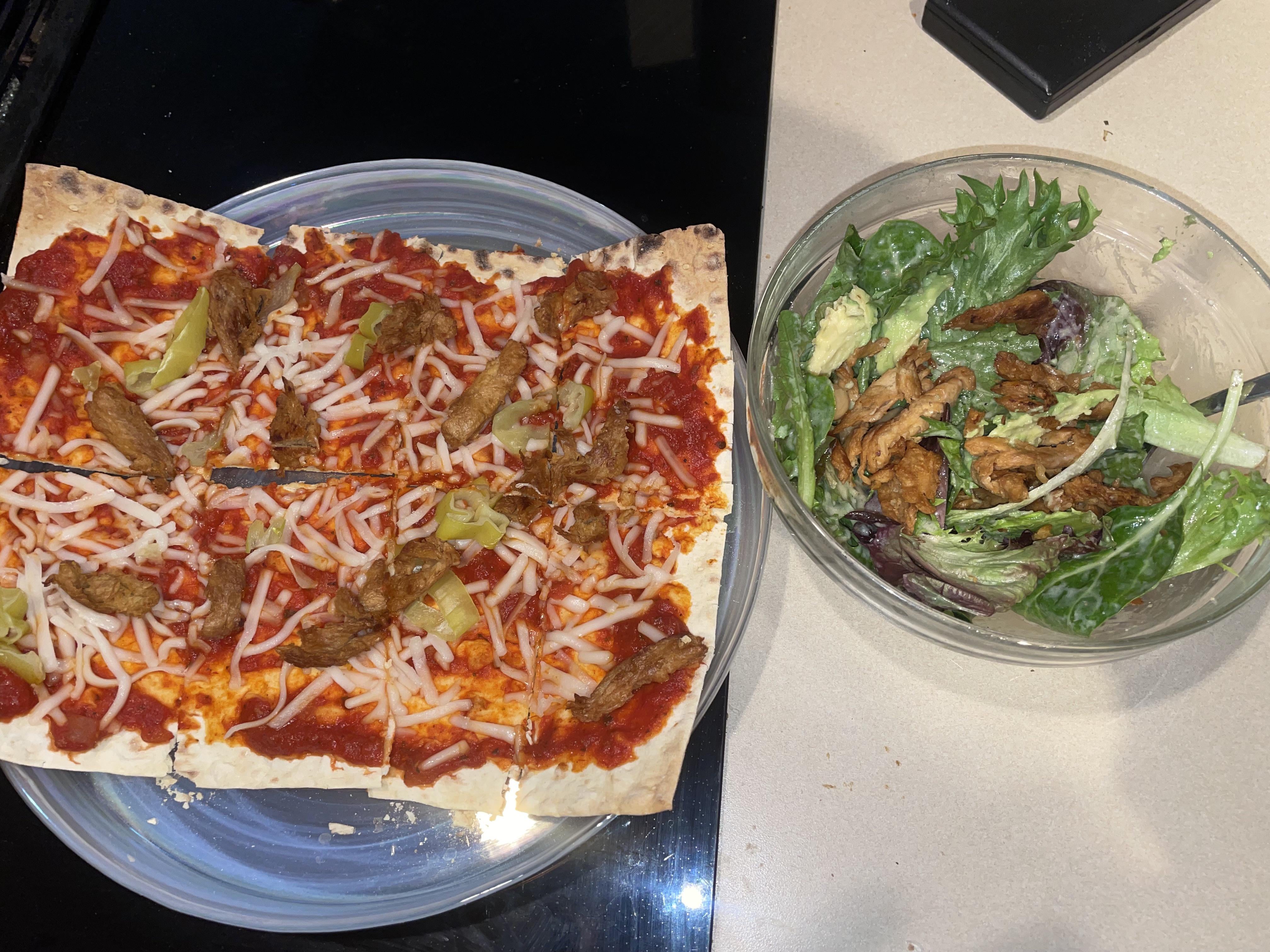 I get the Lavash bread from Trader Joe’s (180 cal), some basic pizza sauce, and vegan mozzarella shreds, then maybe some veggie toppings if I’m feeling fancy.