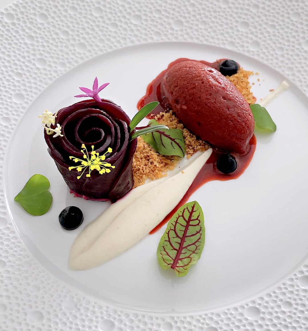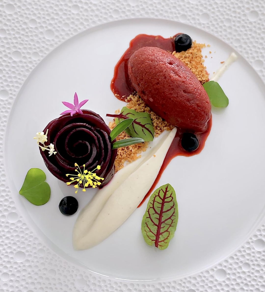 Beet Salad with Beetroot Rose, Beetroot Sorbet, Goat Cheese Mousse, Walnut Crumble & Balsamic Gel by Hai_Cooking Culinary Culinary Plating
