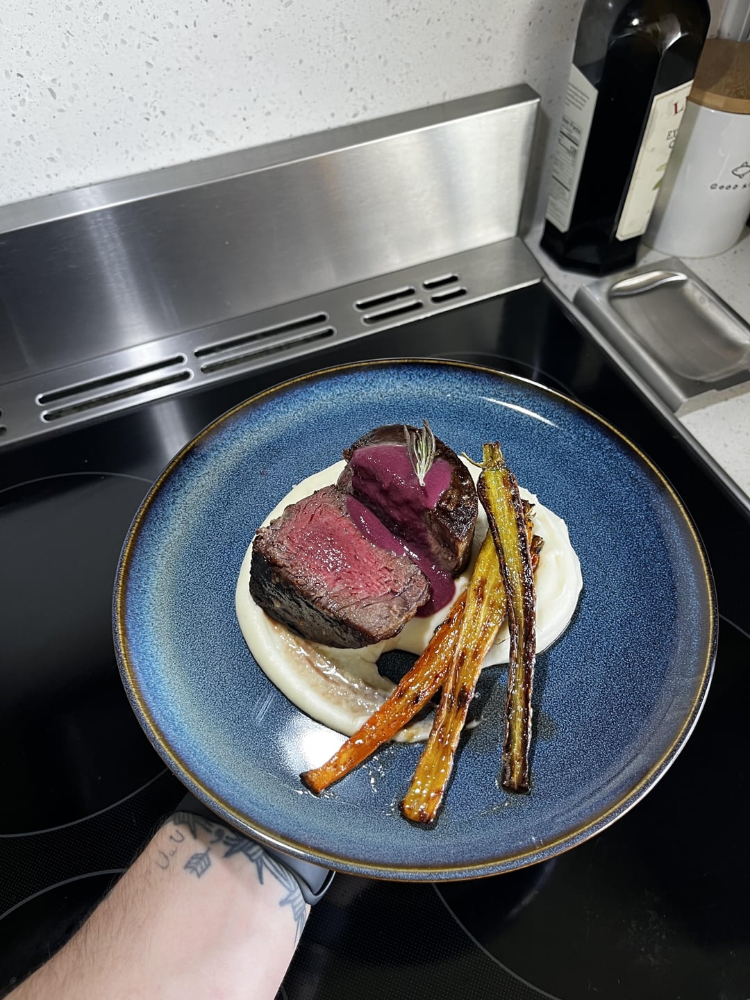 Filet mignon cooked to med, basted in butter and rosemary. served with a parsnip and potatoe puree with grated garlic to season the cream and Parmesan inside the puree. roasted heirloom carrots basted in the browned butter from the steak. A blackberry bordelaise, and garnished with a sprig of rosemary.