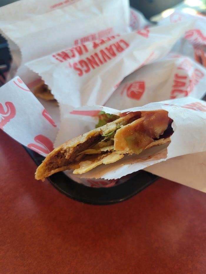 I've heard for years these terrible for you but quite tasty tacos were tofu, but apparently there is beef inside. https://cornucopiadigest.com/jacks-addictively-terrible-tacos/ by SirCatsworthTheThird Vegetarian