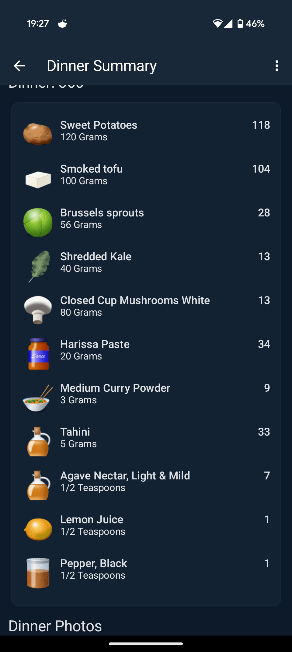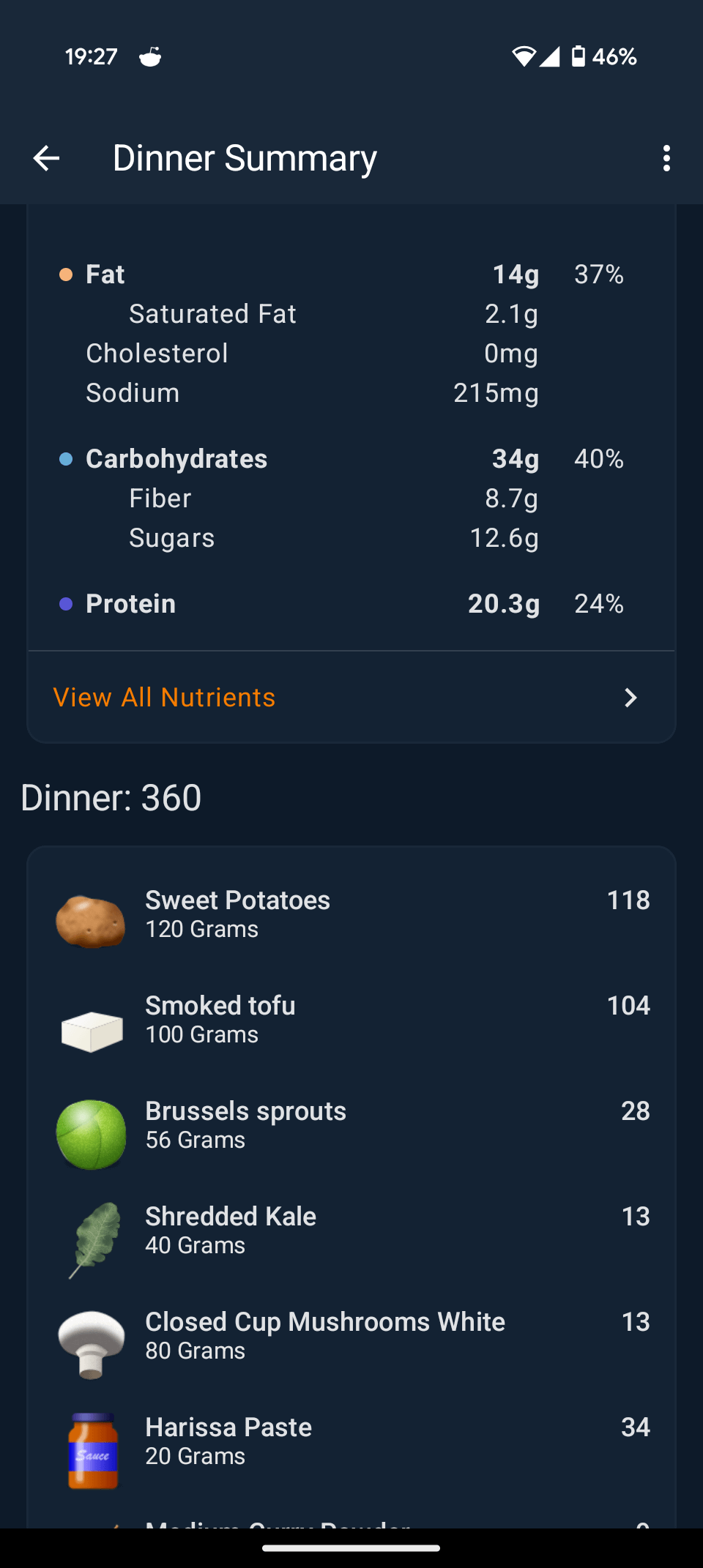 Sweet potato, smoked tofu, kale, mushrooms and brussel sprouts. The sweet potato and tofu I coated in harissa paste, and the mushrooms in some curry powder. No oil added