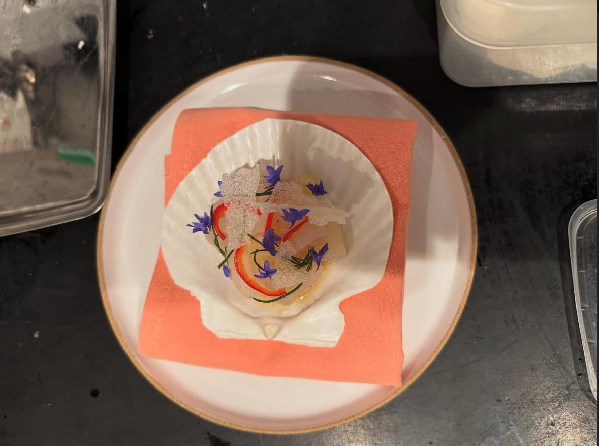 scallop ceviche seasoned with chives, japanese salt mix and a charred lemon infusion. garnished with preserved chilis, sea grass, fried rice paper and button flowers. srry for the shadow😭 by Parking_Ad_3307 Culinary Culinary Plating