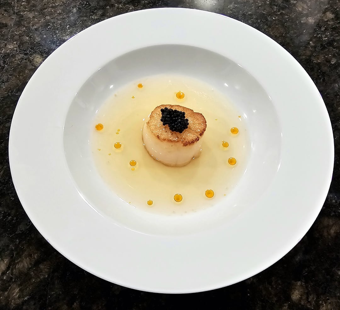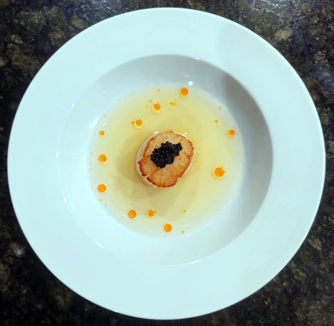 Seared Weathervane scallop, bacon-yuzu dashi, seaweed pearls, chili oil by NW_till_I_Rest Culinary Culinary Plating