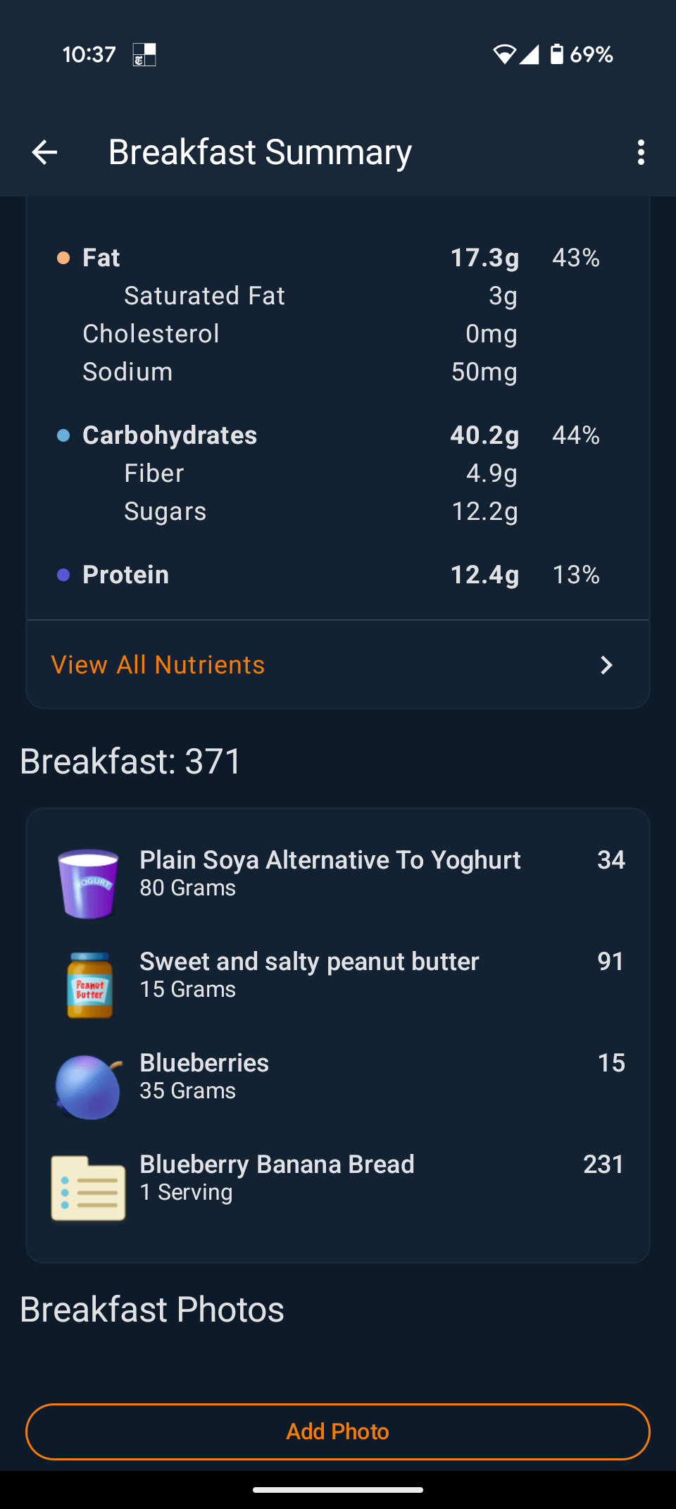 Still going with the banana bread I made a while ago, still two slices frozen. It's sooooo yummy 😋 Also still in a need to have yoghurt every day phase and in a permanent pb phase haha. Not as much protein as I'd like in breakfast but it was delicious!