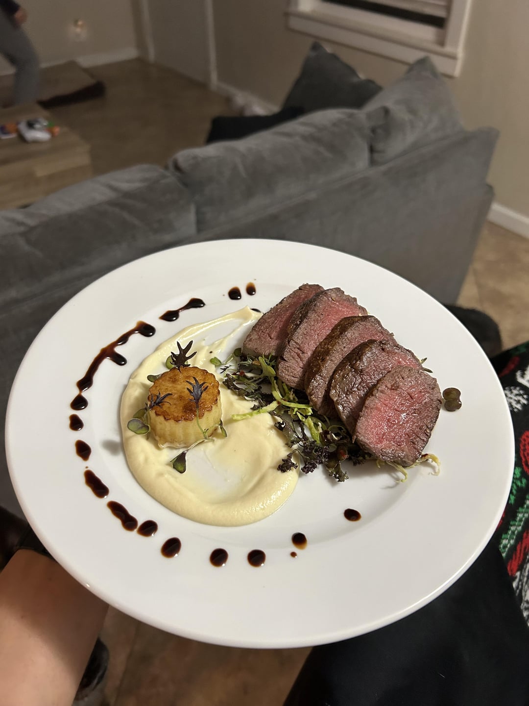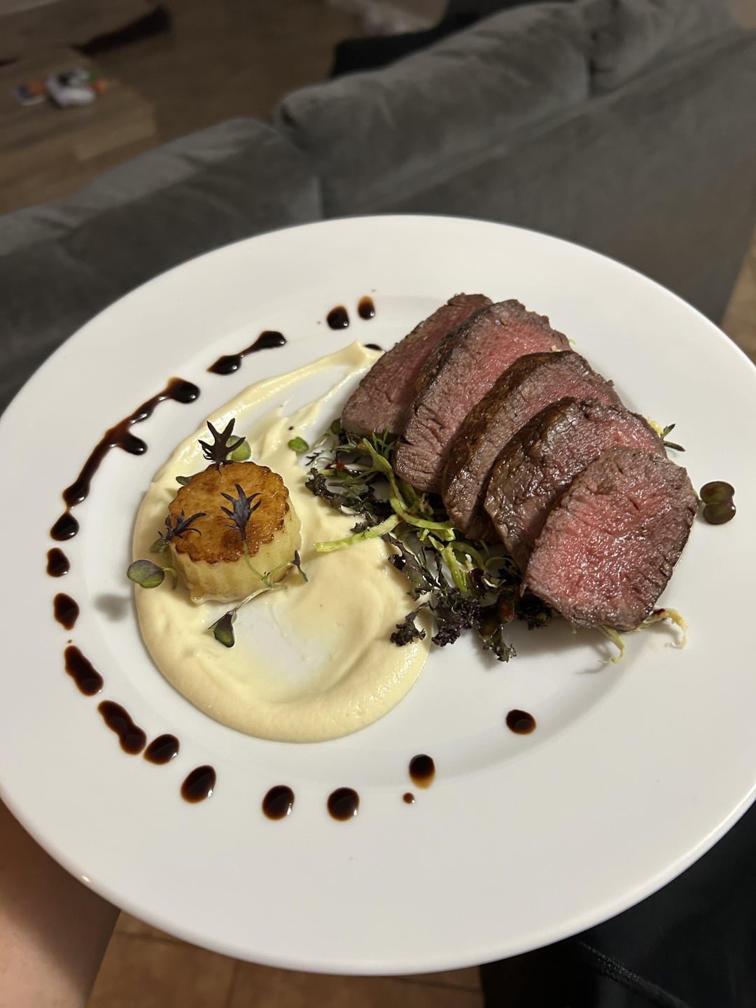 American wagyu tenderloin on bed of Brussel, Kale salad. Confit potato on Cauliflower puree. Balsamic, Red Wine reduction on rim. by Sagewithapan Culinary Culinary Plating