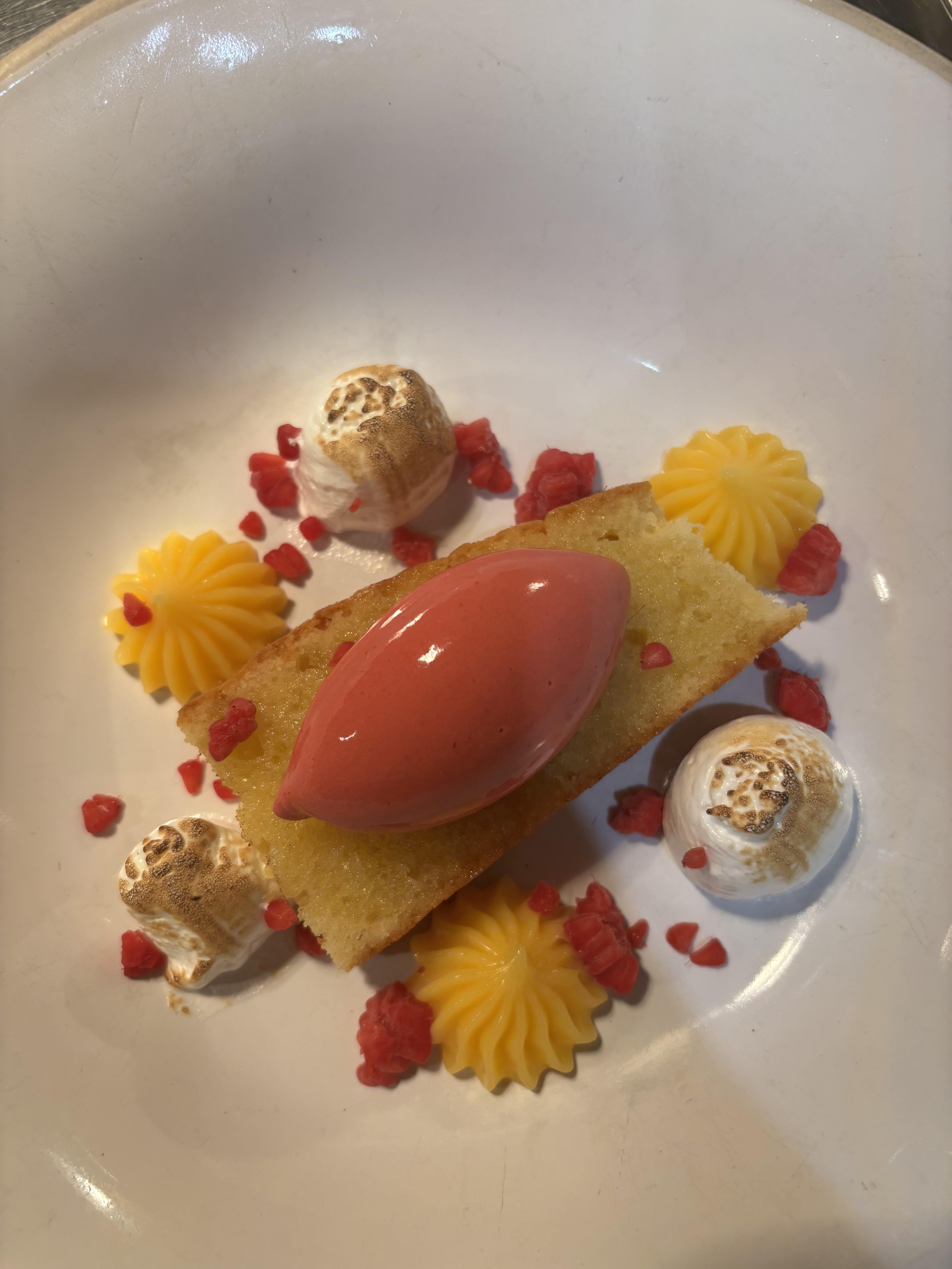 Olive oil sponge, lemon curd, Italian meringue, raspberry