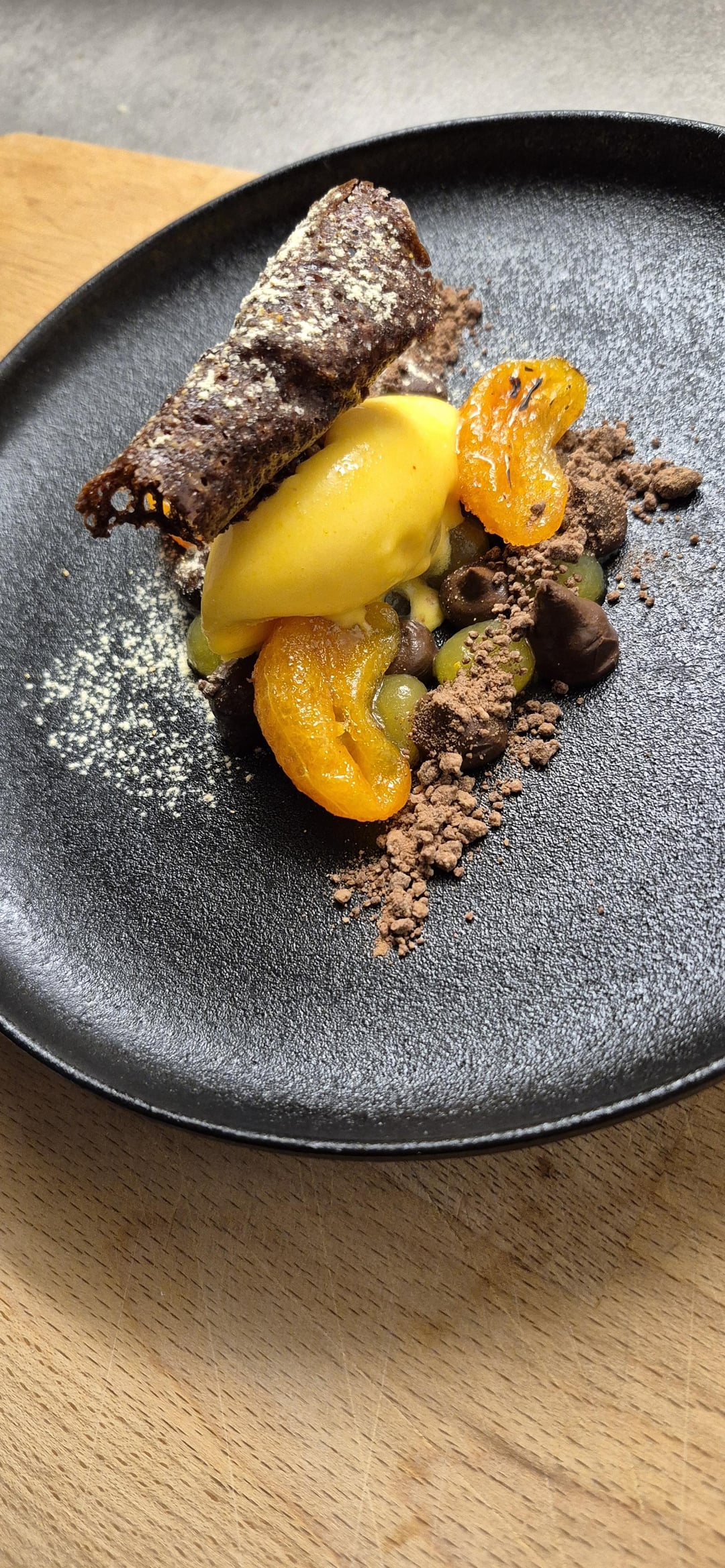 Dark chocolate ganache, mandarin sherbet, mandarin gel, candied mandarin, crystallized chocolate and, choco tuille. Thoughts about plating? by Cmdr_W0lff3 Culinary Culinary Plating