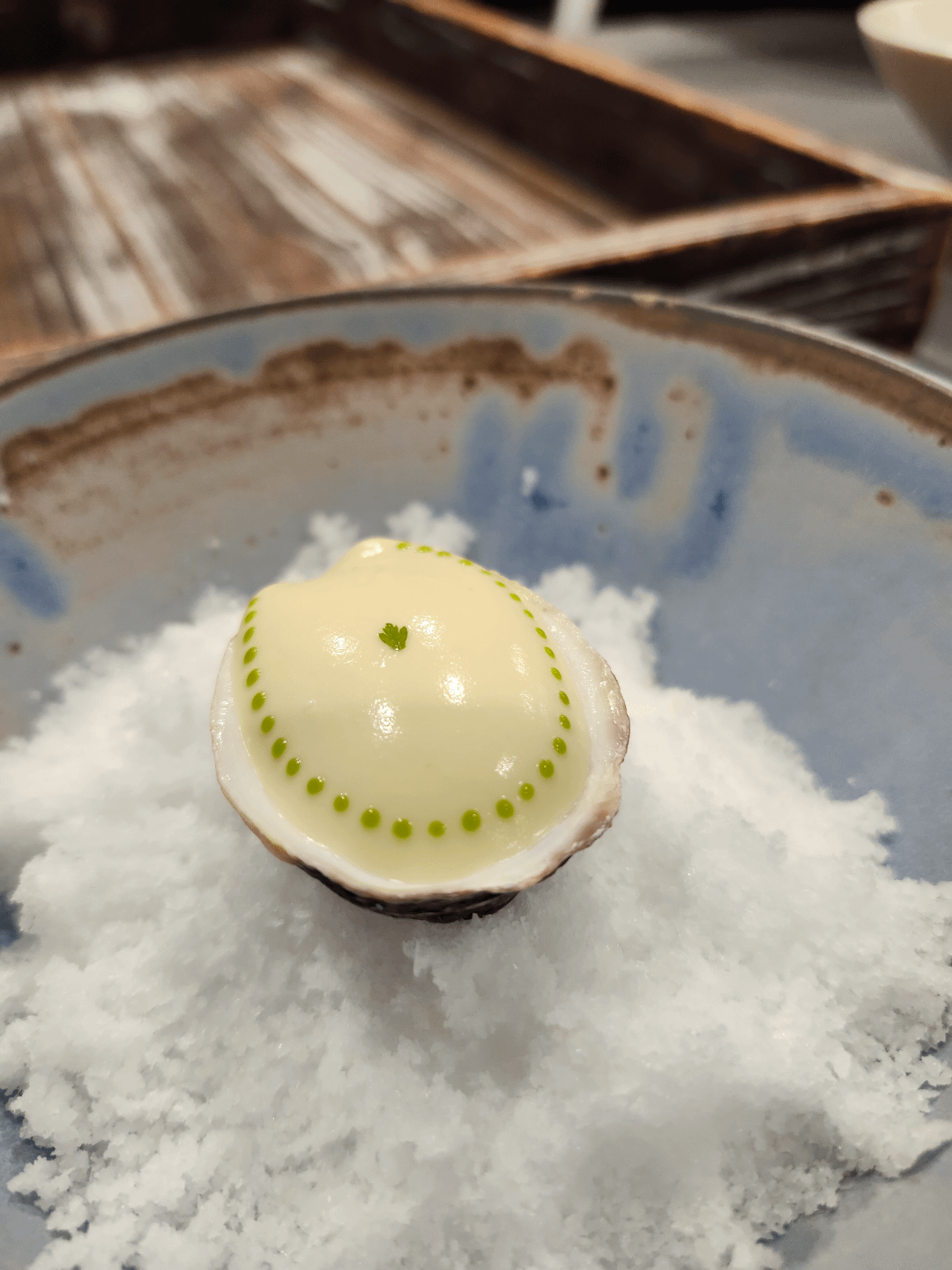 Green dots (35), cauliflower cream, gently poached oyster, caviar, and white wine gelée. Teeny tiny piece of chervil. by dirtbaglinecook Culinary Culinary Plating