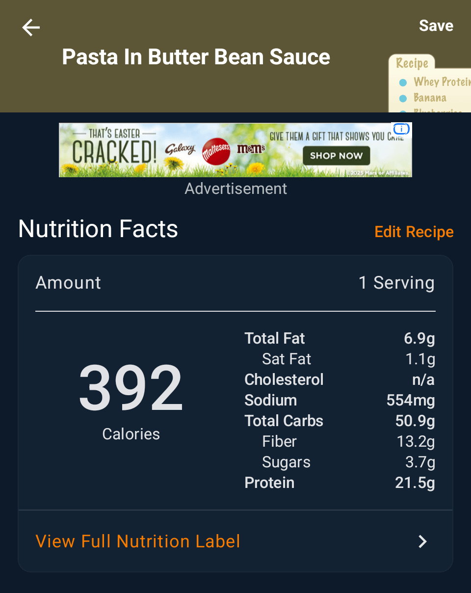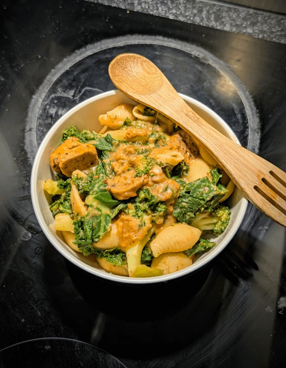 Pasta with kale, broccoli and a sausage in a butter bean sauce. Fairly quick and easy and quite yummy! Trying to get more protein and this butter bean sauce was a nice way to do it, in addition to the sausage