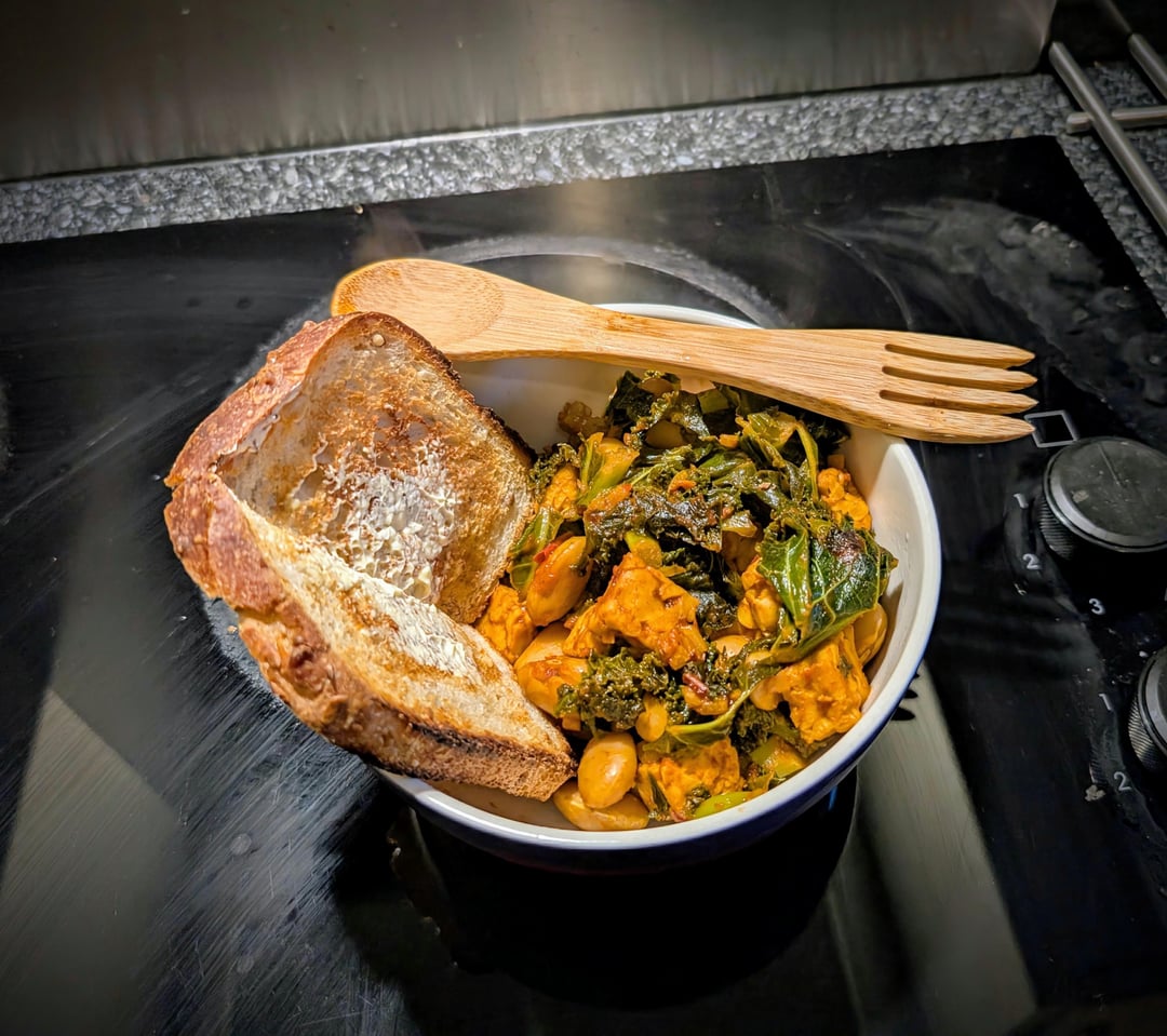 I just steamed the kale in the pan for about 8 minutes then added garlic, tempeh and butter beans and let those warm through and slightly toast the beans once the water had evaporated. Then added harissa paste and tomato paste and mixed that through. Let it cook a bit more then added some oat milk right at the end and simmered it until the water had again evaporated