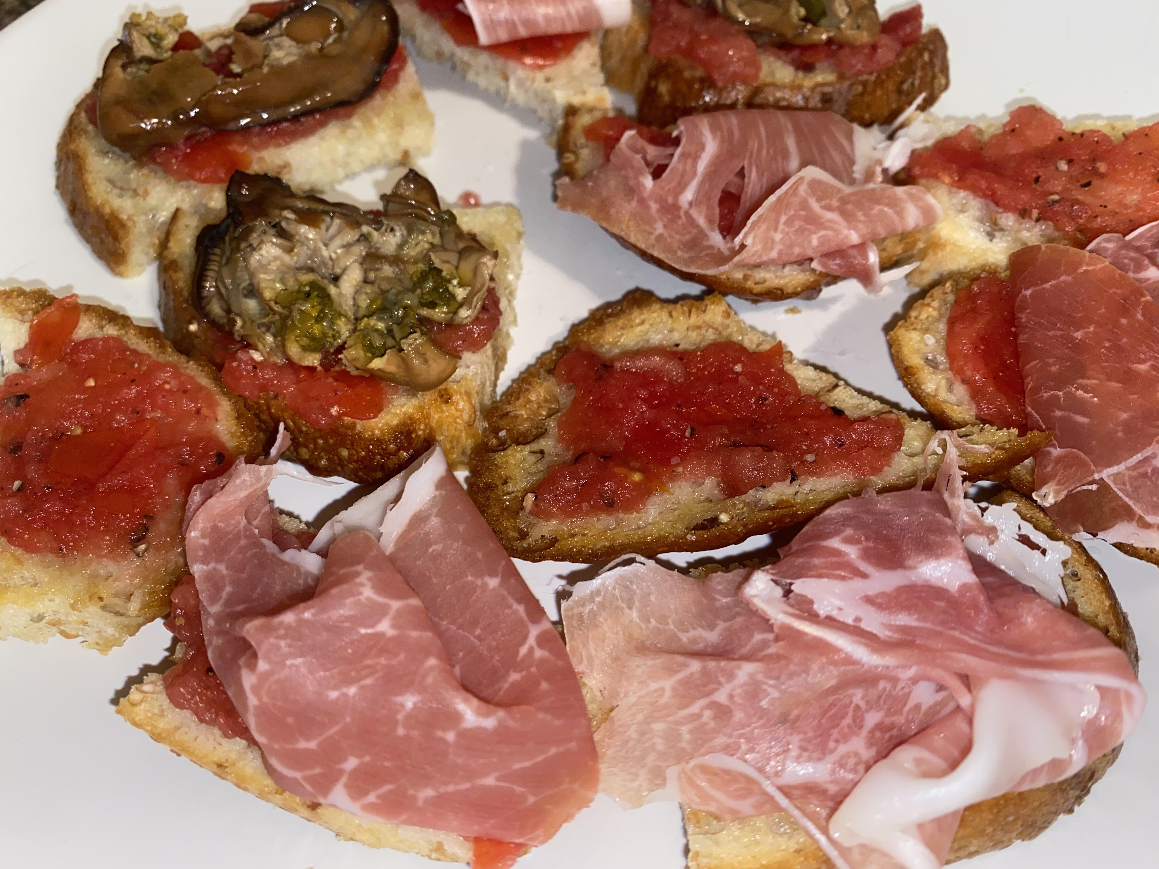 Pan con Tomate – my first attempt. Some plain, some topped with prosciutto and some topped with smoked canned oysters! Everything smells like garlic… I don’t hate it.