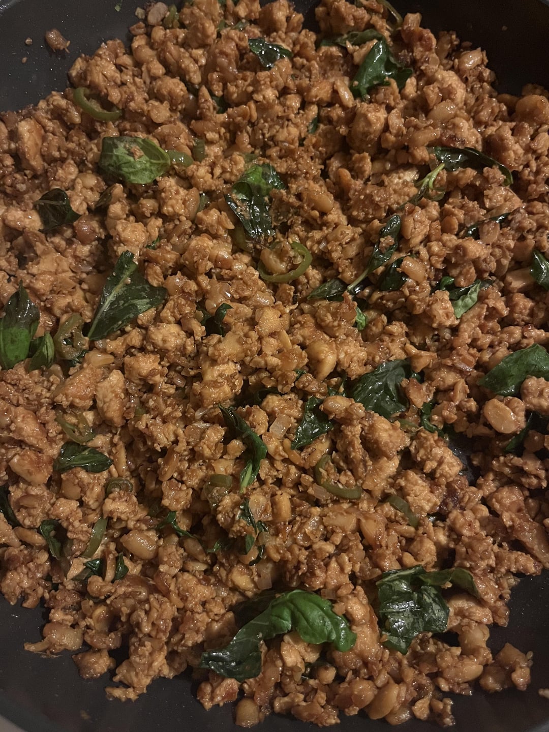 I steamed and crumbled some tempeh, and pressed and crumbled some super firm tofu, marinated in a teriyaki sauce, and then baked it until crispy! Then I dumped it in a skillet I had going with ginger, garlic, shallot, and spicy peppers. Then I added some vegetarian oyster sauce, some veggie stock, and some basil to finish it off!