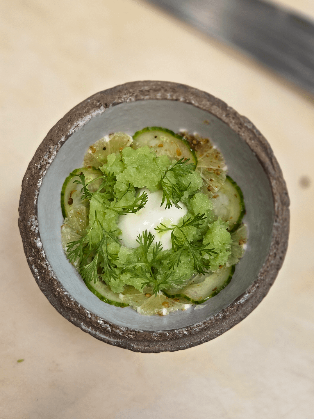 Compressed lime and cucumber with coriander. Buttermilk gel. Cucumber and herb granita. Bolted cilantro.