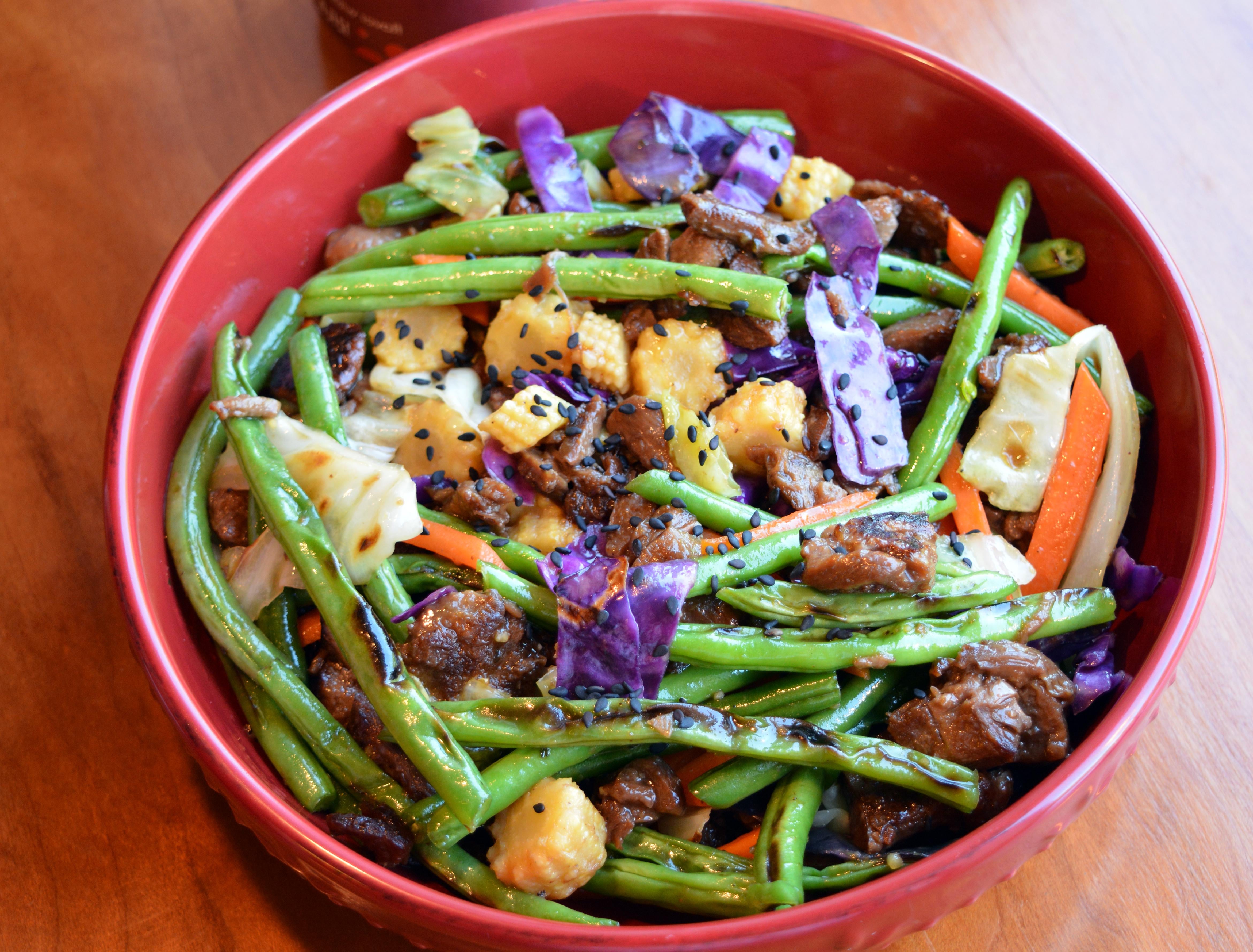 (348 cal, 29 g protein) Beyond steak sesame ginger stir fry with green beans, cabbage, baby corn, carrot