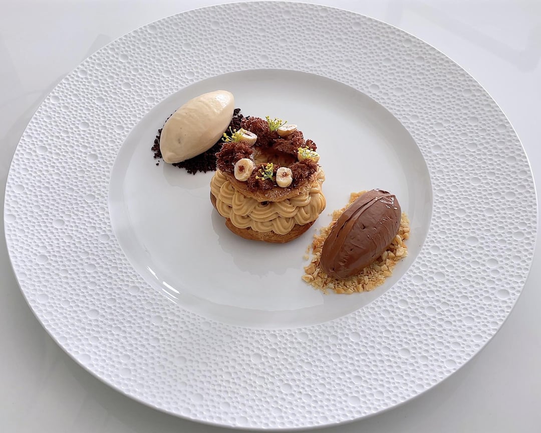Choux pastry, hazelnut praline, praline pastry cream, roasted hazelnuts, hazelnut ice cream, chocolate sponge cake, chocolate soil & chocolate cremeux (botched the quenelle on this so don’t go too harsh on me lol) by Hai_Cooking Culinary Culinary Plating