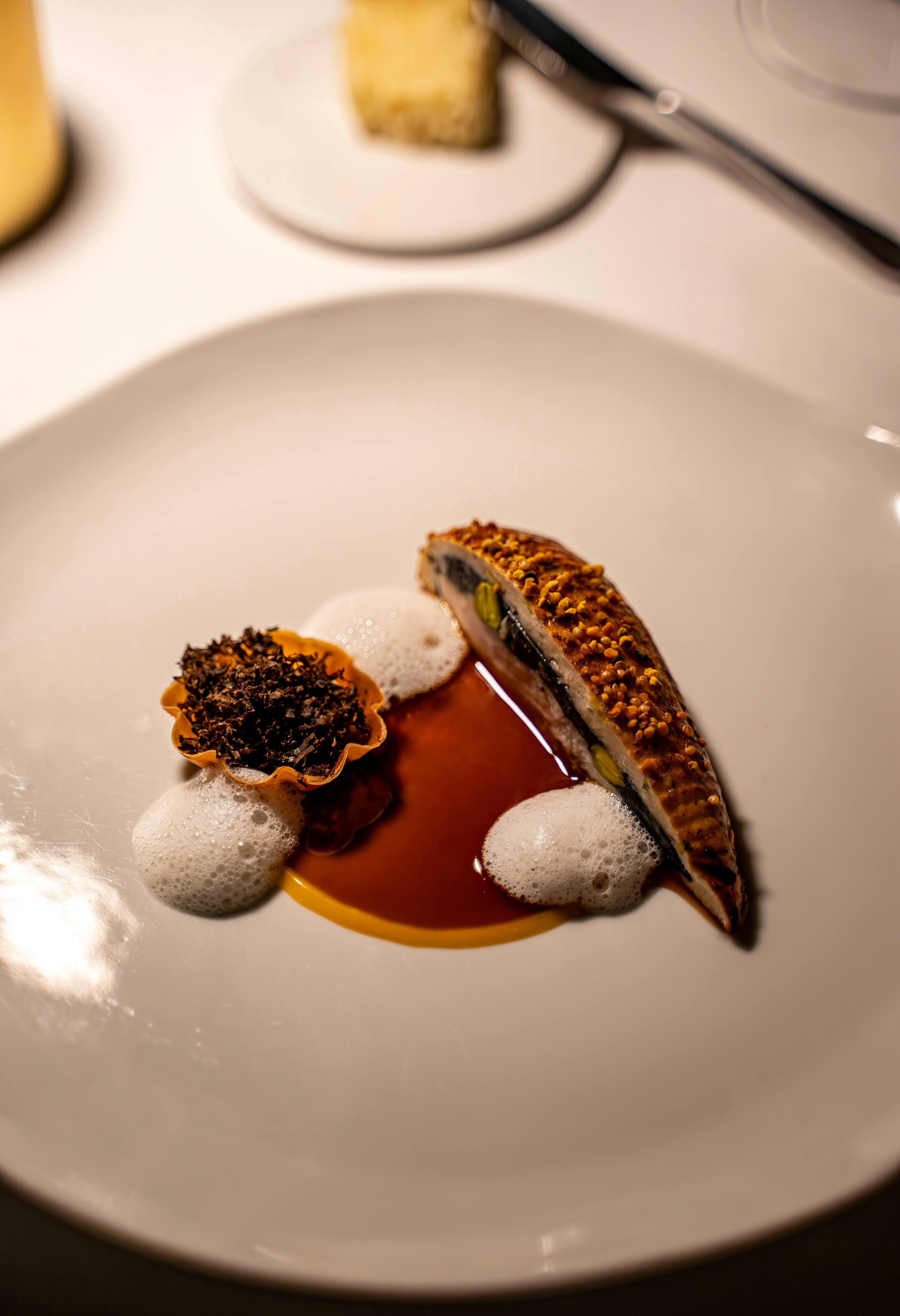 Inverted chicken ballotine with black truffle, foie gras, lardo di colonata and pistachio. Deep chicken jus, smoked egg yolk cream and artichoke x truffle tartelette. We finish the plate table side with Parmesan air. by No_Committee_7874 Culinary Culinary Plating