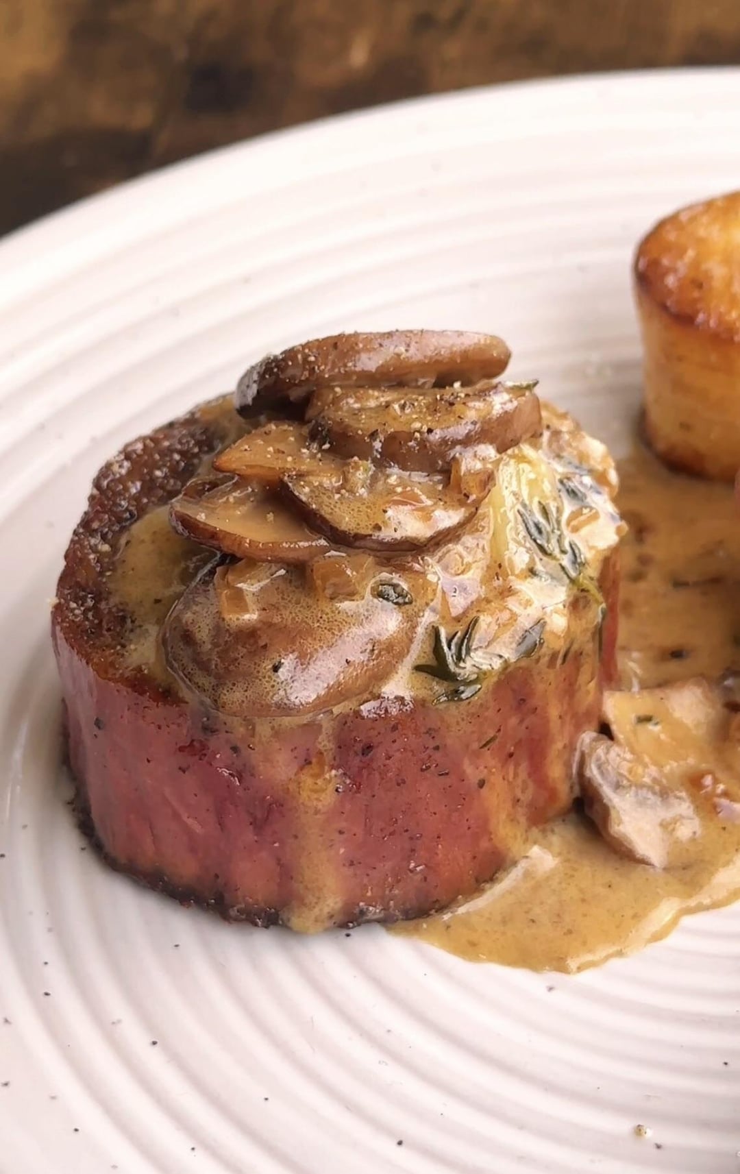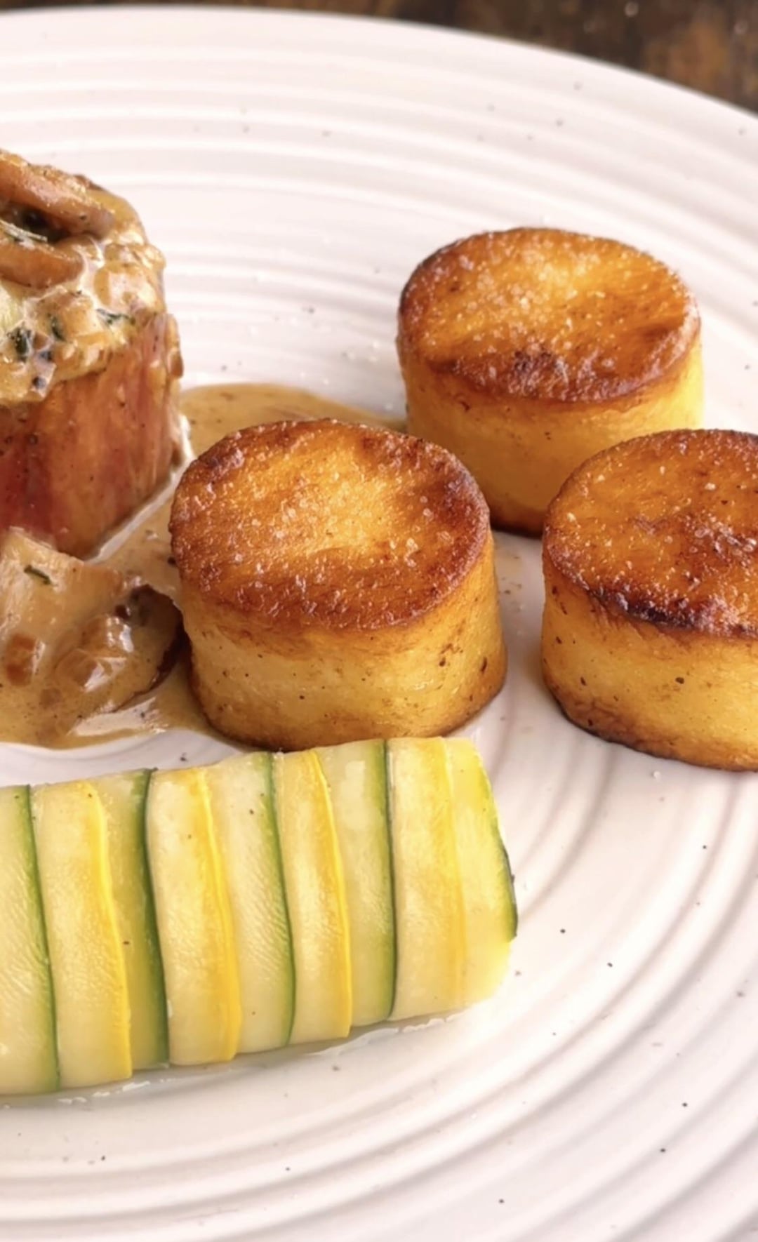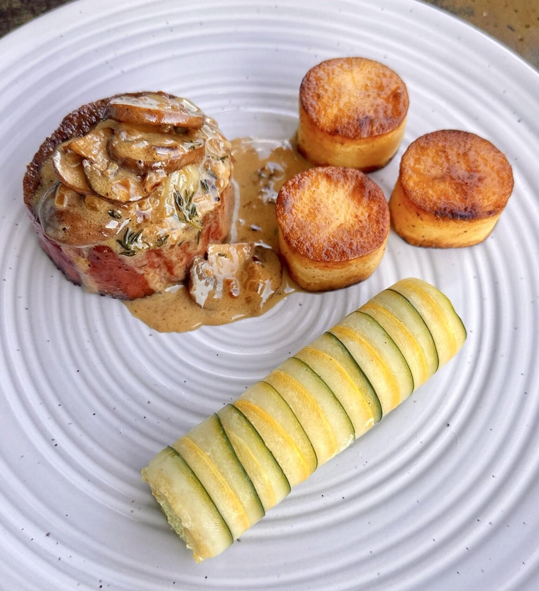 Steak au poivre, fondant potatoes, and zucchini cannellini filled with an English pea mousse. For the steak, I used juicy marbles! by dedetable Culinary Culinary Plating