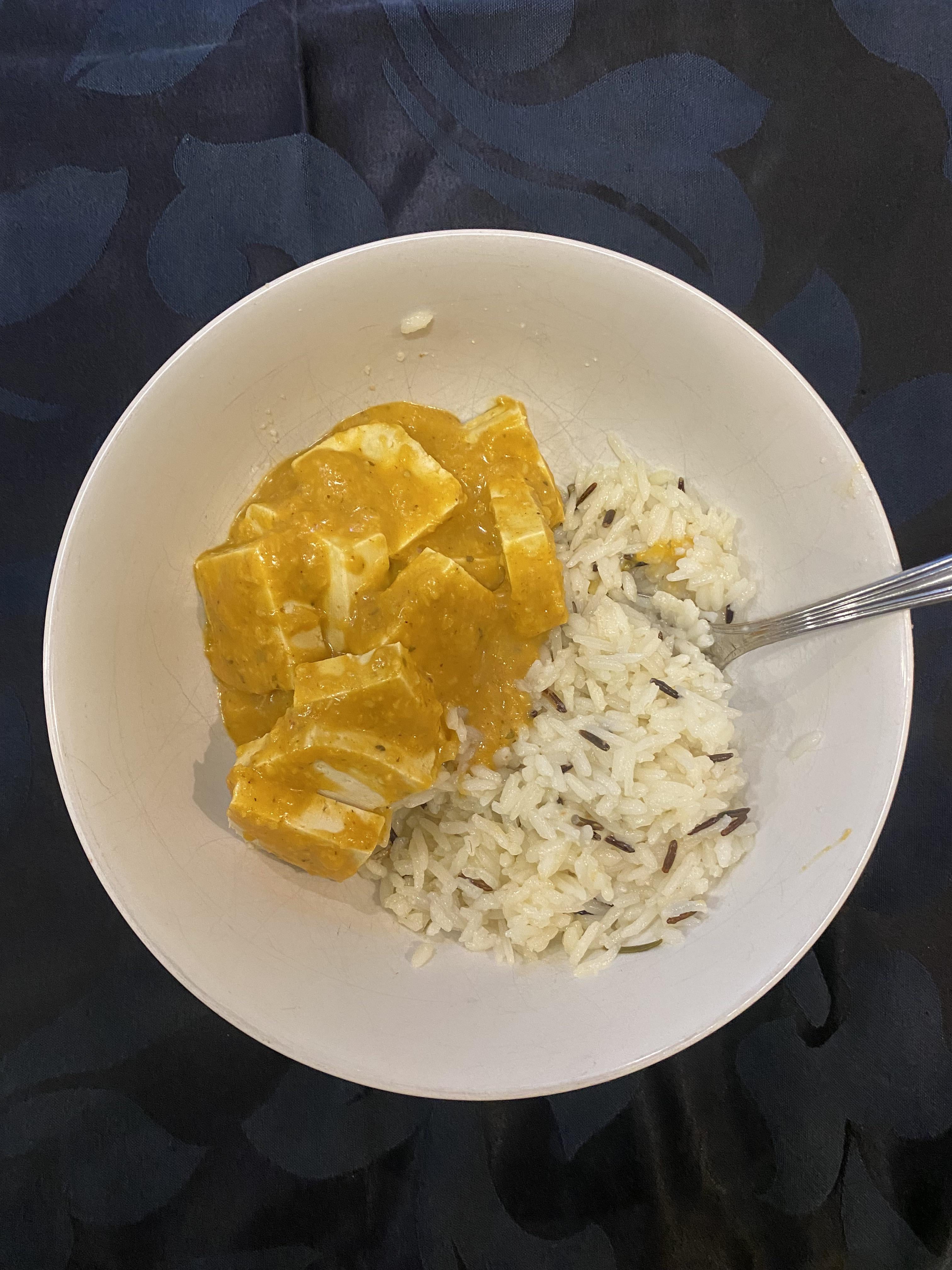 Delicious tofu korma masala with Portuguese “Carolino” rice