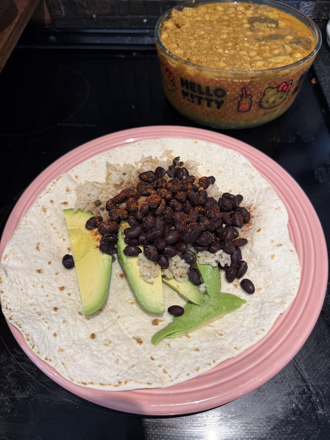 Avocado, rice (seasoned), black beans rinsed and warmed up, seasoning (chipotle, paprika, salt).
