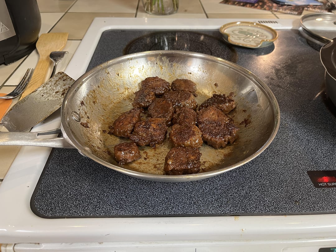 I mixed the VWG 1:1 with seasoned water, fried at a lowish temp m, boiled for 20 minutes in a steak tips marinade, then fried for a little more.