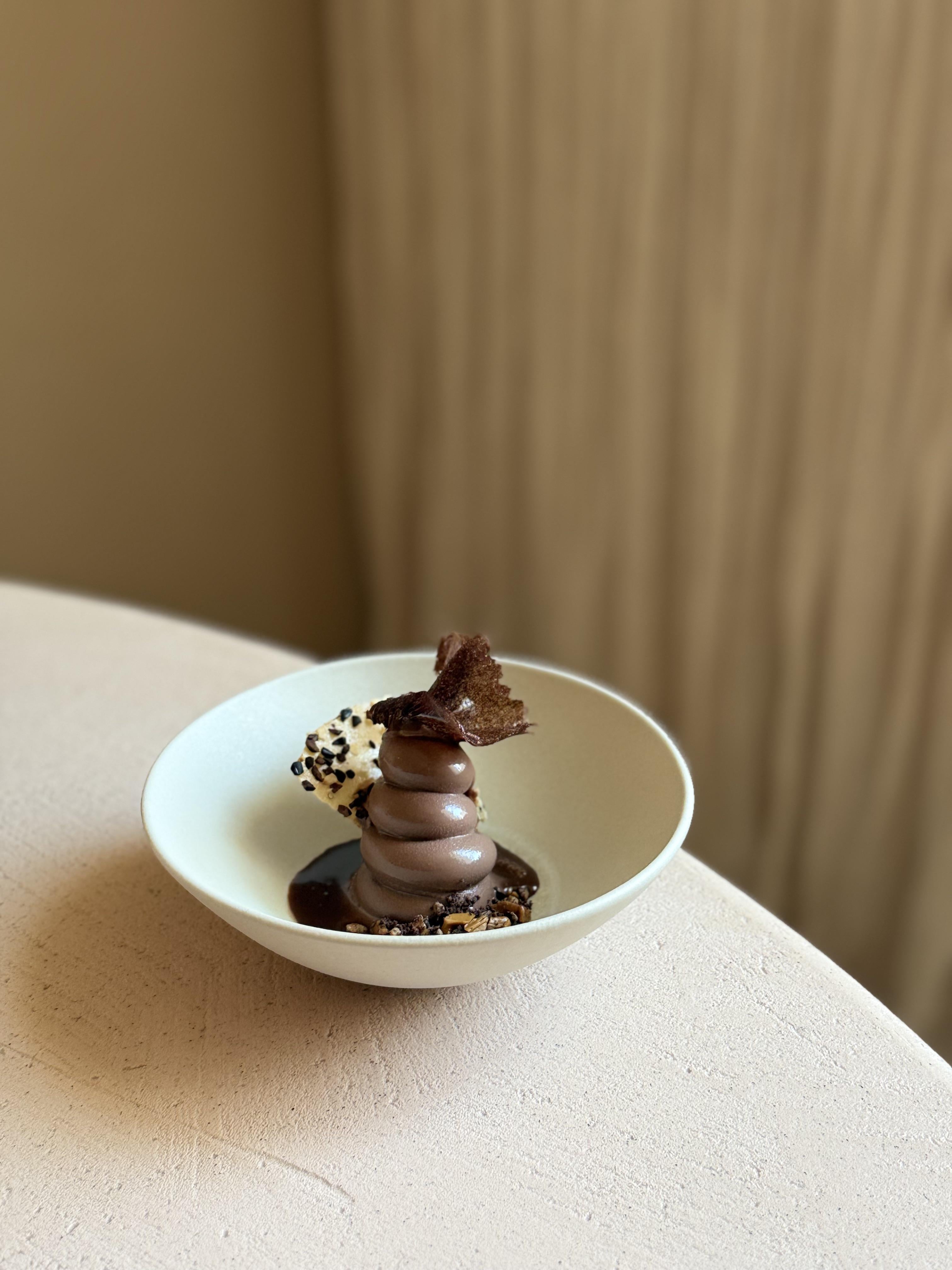 Gianduja soft serve, sea buckthorn cremeux, cacao nibs & salted caramel crumble, hazelnut chips, chocolate caramel tuille. Table side we pour a hot chocolate hazelnut sauce. by martijndefauw Culinary Culinary Plating