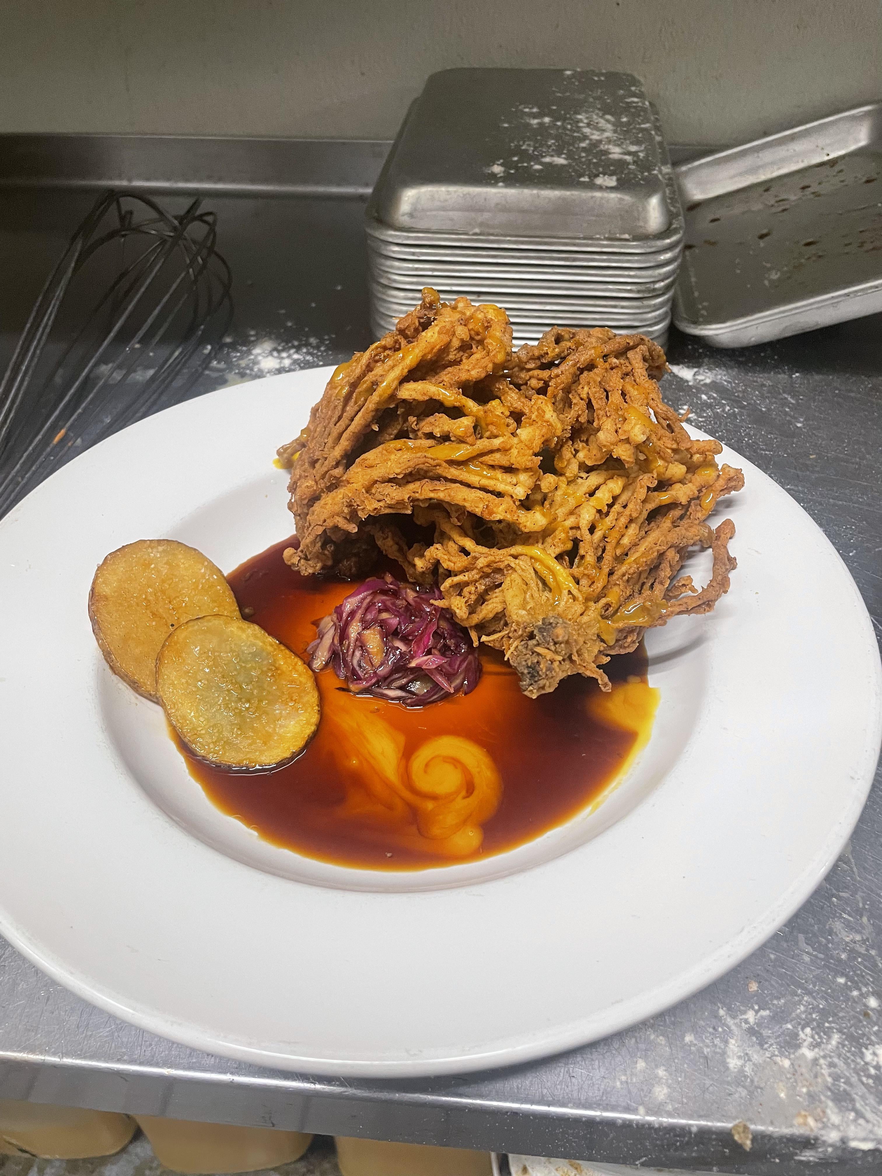 You need to tighten up your handling of the enoki. They do not look properly trimmed. The mycelium end has got to go. Also they are arranged in a very “rustic” way, but having them just leaning against the rim of the plate looks messy. I’m not sure what the two thin slices of “softened potato” are there to achieve. The pool of sauce on the entire bottom of the plate is very off putting especially when the main component is fried. You might be better off making the potato (even the cabbage as well) into a fusion potato salad and using the sauce as part of the dressing. Focus on the star of your dish and maybe make it stand out. There are gochugaru blends that are not crazy spicy but still flavorful and very vividly colored that could elevate the dish if added to your batter.
